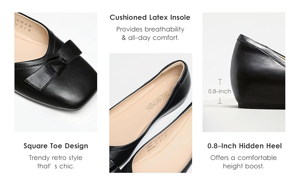• Cushiony Comfort: Featuring a soft vegan leather-covered insole, lining, and heel cushion, these dress flats offer long-lasting comfort.