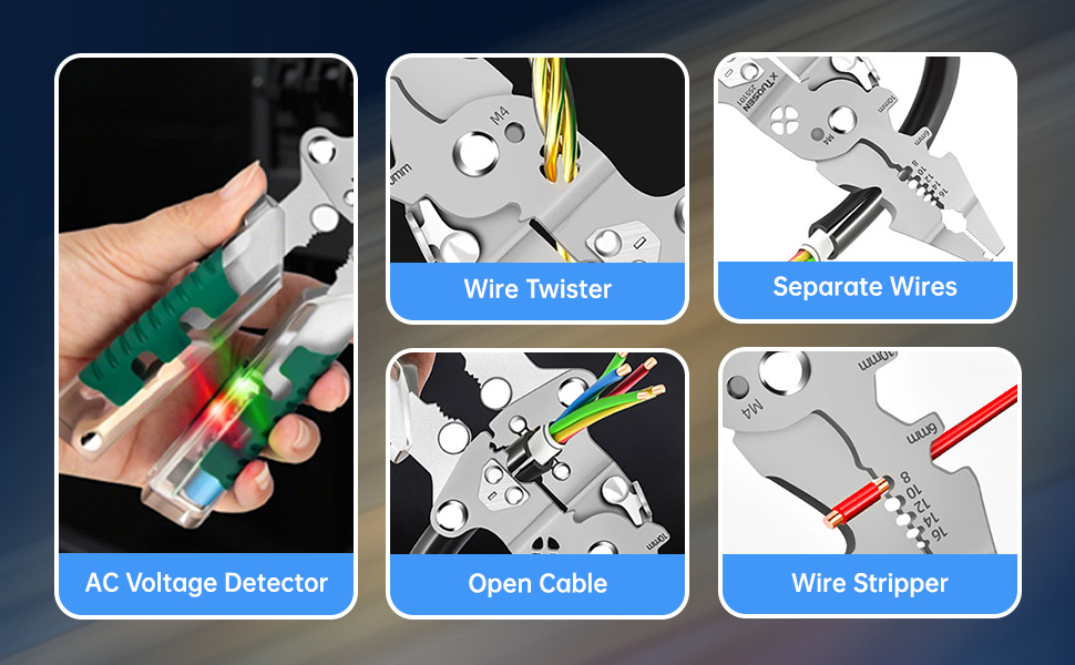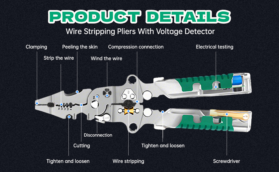 【18-in-1Multifunctional Wire Strippers】Tuvilo electrical pliers have been upgraded based on the original,Combines 18 essential functions including wire stripping, cutting, crimping, bolt trimming, voltage testing, screwdriver use, looping, deburring, and more — all in one compacteliminate multiple pliers and streamline every electrical job.