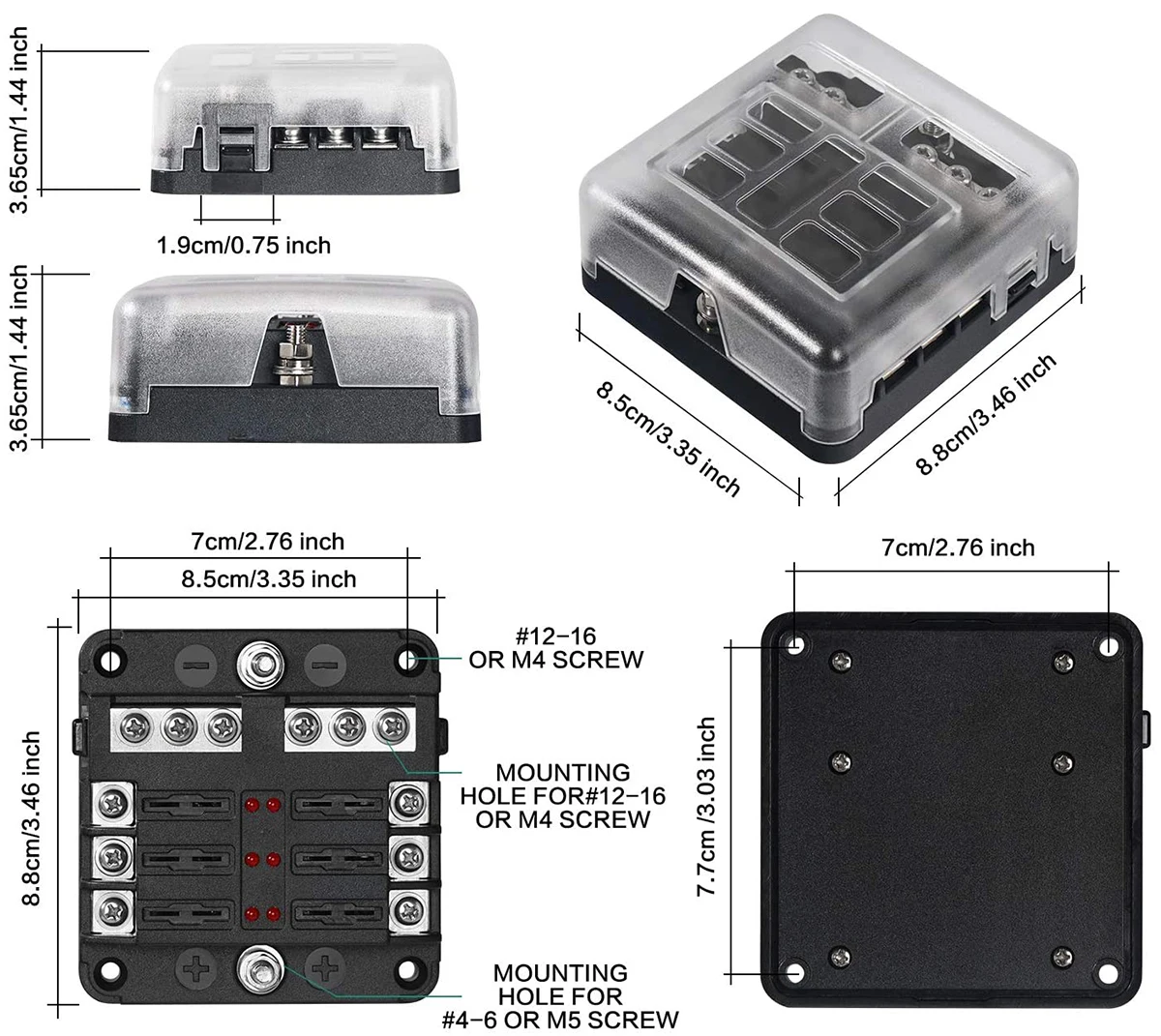 【UNIVERSAL PROTECTION】– The input rated voltage of the fuse box is 32V,and the input rated current is 100A.Each circuit outputs a maximum current of 30A. All bus bars and fuse pieces are nickel-plated copper, corrosion-resistant and highly conductive.