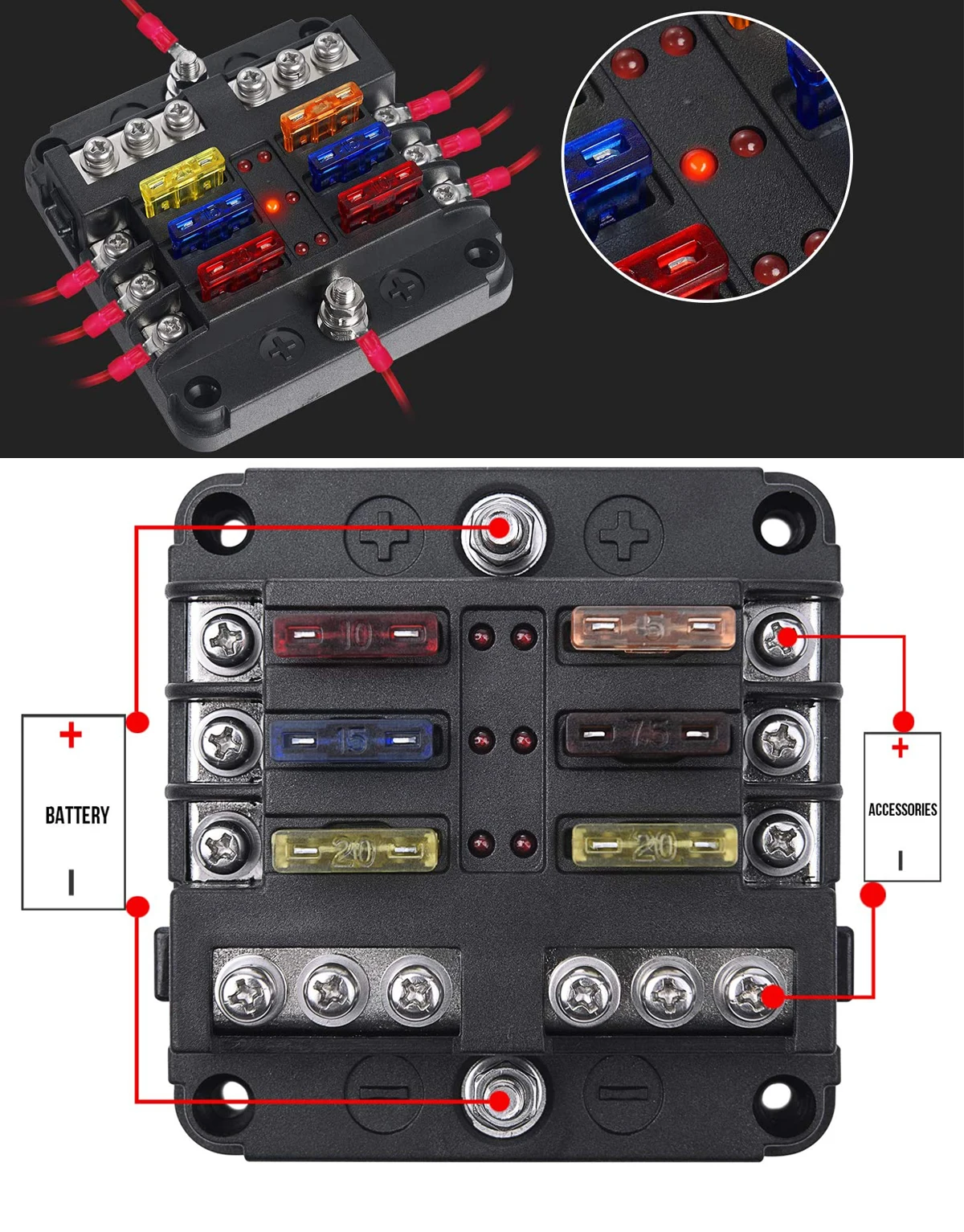 The 6 positive and negative poles of the fuse box make wiring operation easier.