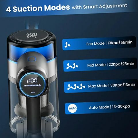 • Versatile Cleaning and Easy to Use: The INSE rechargeable cordless vacuum cleaner is equipped with a 2-in-1 brush, long crevice, and extensible metal tube, making you clean stairs, curtains, windowsills, sofas, beds, cars, RVs, and other hard-to-reach places with ease. The lightweight design and ergonomic handle make operating it effortless with one hand. The "One-Button Dust Dumping" design makes emptying simple and efficient.