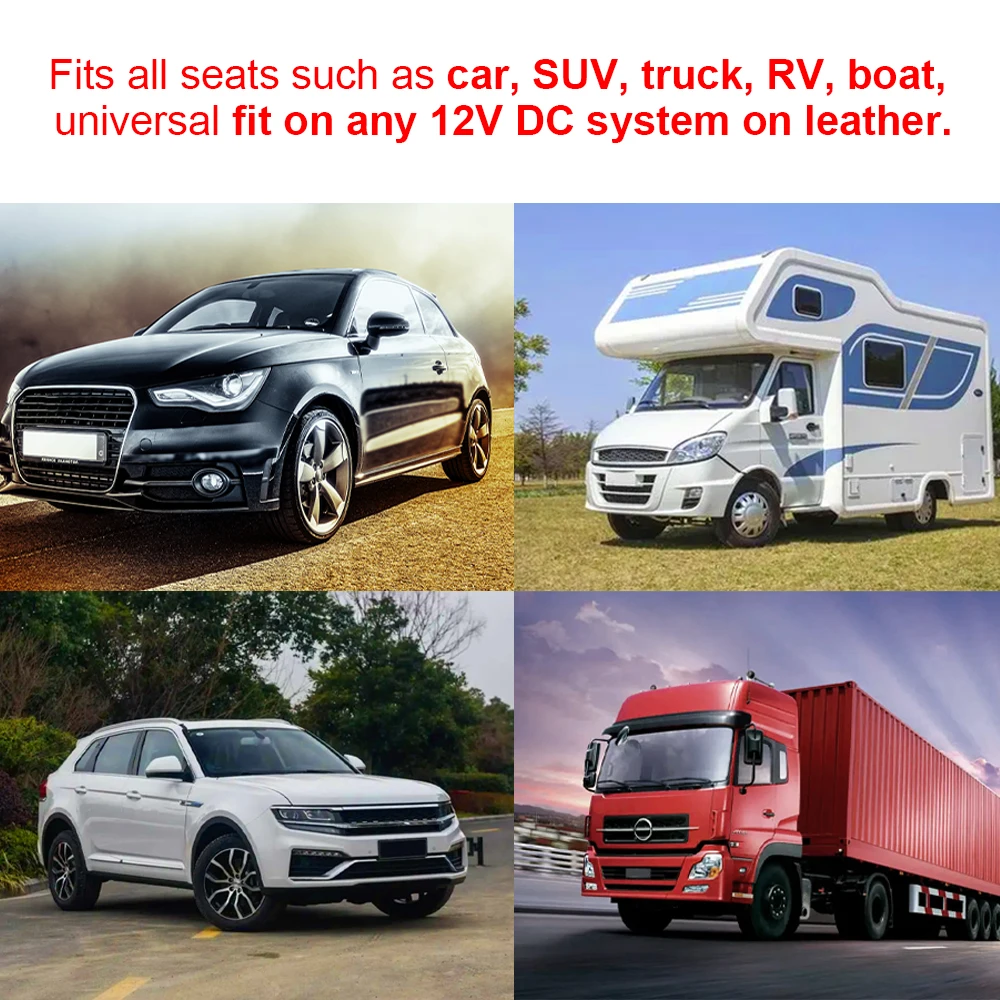 Fits all seats such as car, SUV, truck, RV, boat, universal fit on any 12V DC system on leather.