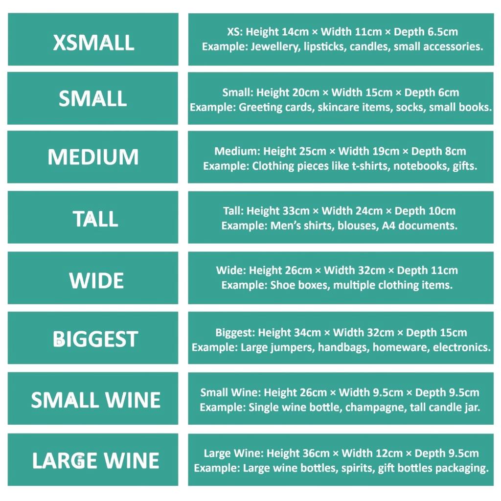 - Medium: Height 25cm × Width 19cm × Depth 8cm - Example: Clothing pieces like t-shirts, notebooks, boxed gifts.