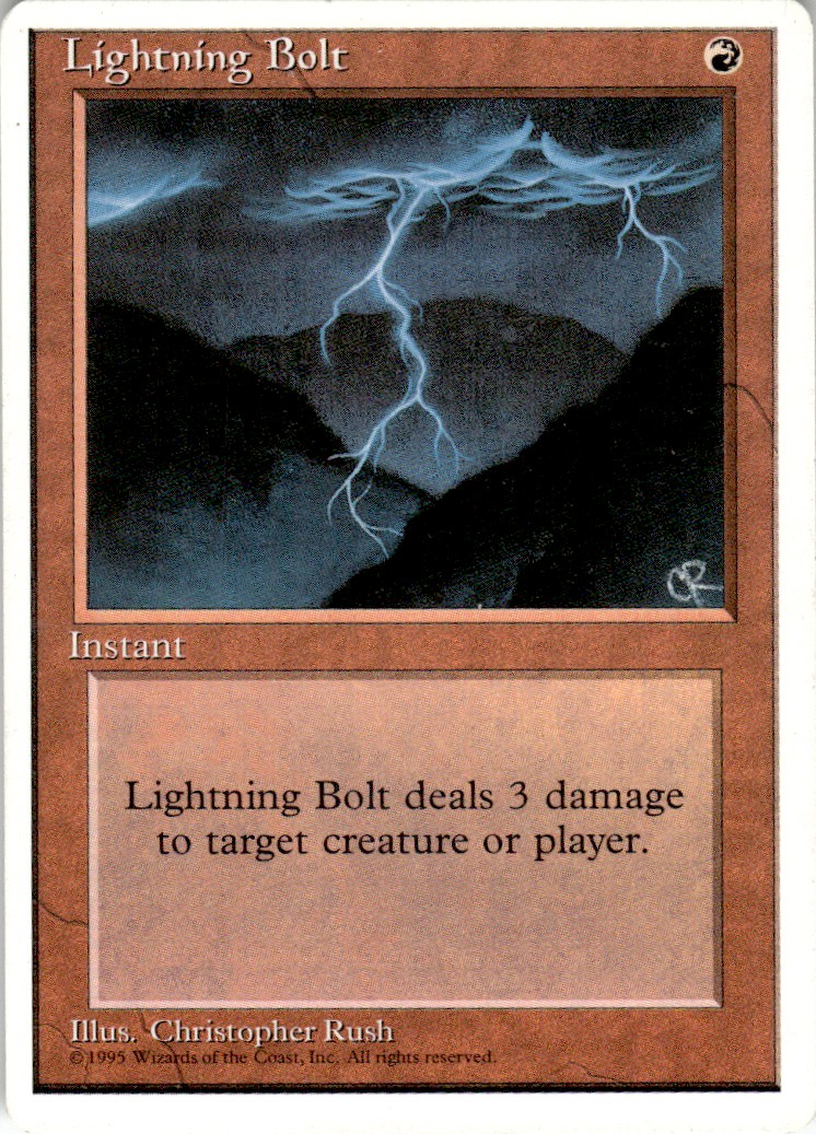 | Description: | Lightning Bolt | | Category: | Magic | | Year: | 1995 | | Product: | Magic The Gathering | | Set: | Fourth Edition | | Special: | Light Play | | Dimensions: | 3½" x 2½" | | SKU: | MG B0004 R03 C (26) |