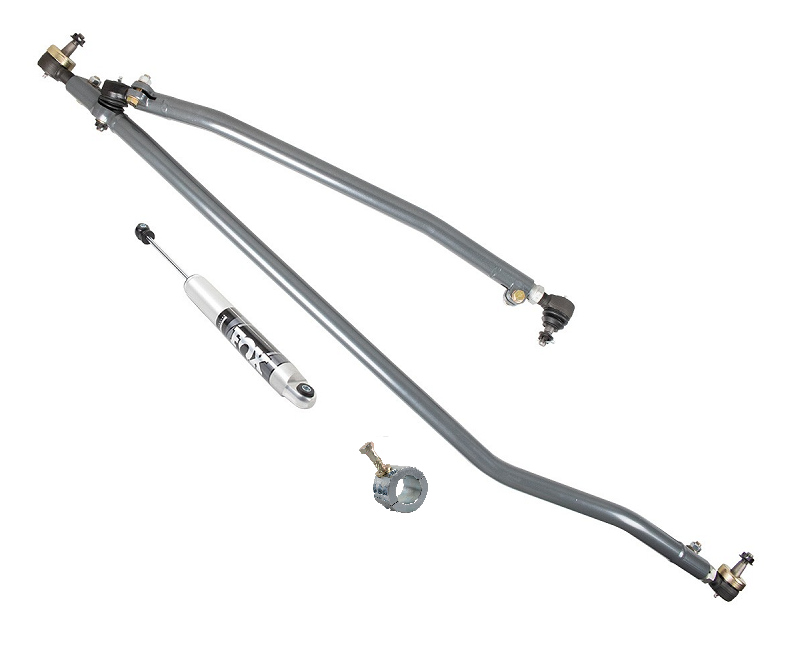 This Heavy Duty Steering Kit is a larger and stronger, bolt-on replacement for the stock steering. No drilling or reaming of the knuckles is required. It uses the updated factory T-style steering design to eliminate toe-change caused by Y-style steering. Using the factory T-style steering design also results in no induced bump steer inherent with most aftermarket "cross over" steering kits. The Tie Rod also uses low misalignment "wobble stopper" Tie Rod End Boots to prevent unwanted Tie Rod "flop" which results in a dead spot in the steering when changing direction. The complete kit includes a heavy duty Drag Link, heavy duty Tie Rod, and Steering Stabilizer Mount Kit for use with stock or aftermarket steering stabilizers using a 1/2" mounting bolt.