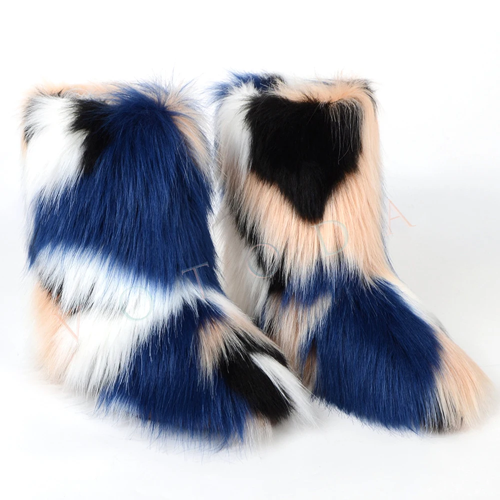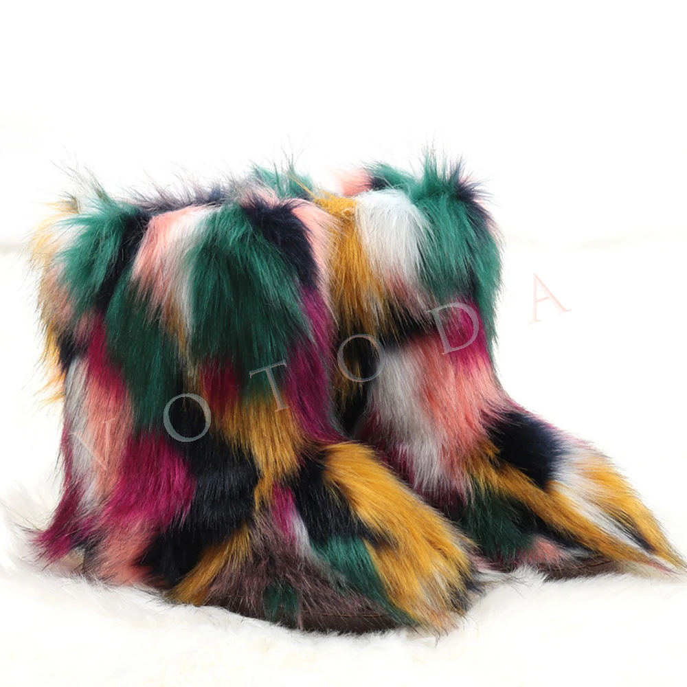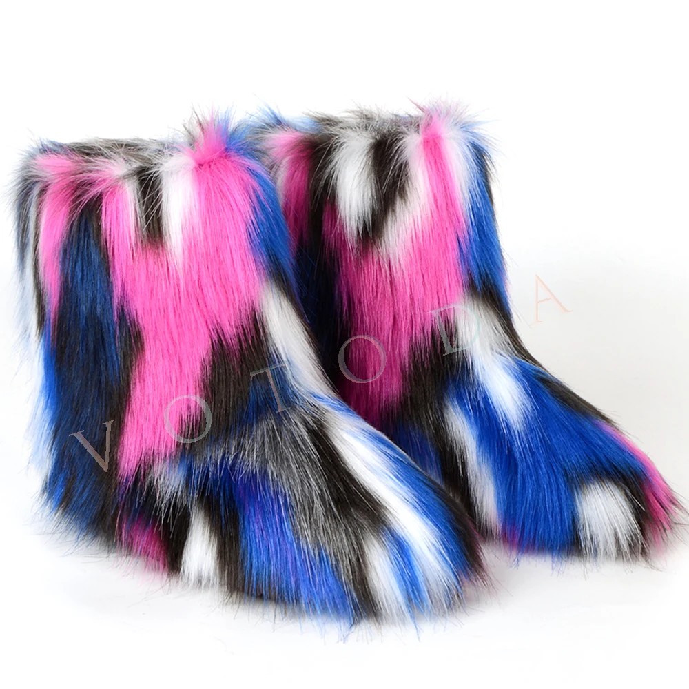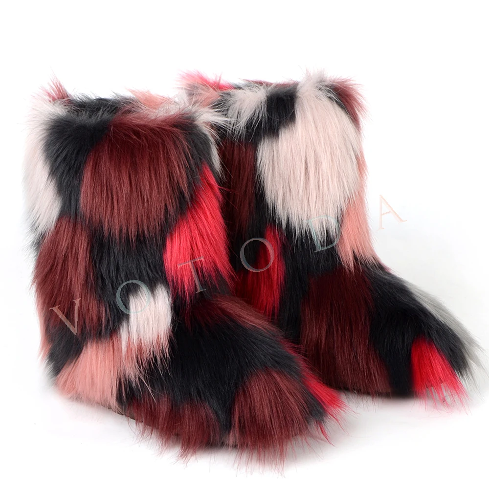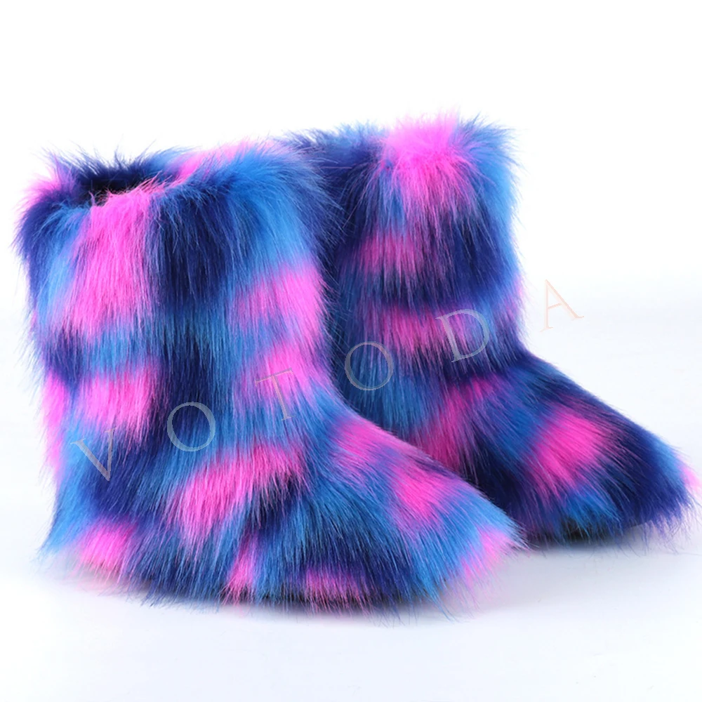 New Winter Women Fur Boots Woman Fluffy Furry Faux Fur Snow Boots Female Plush Outside Flat Shoe Ladies Warm Slip On Ankle Boots
