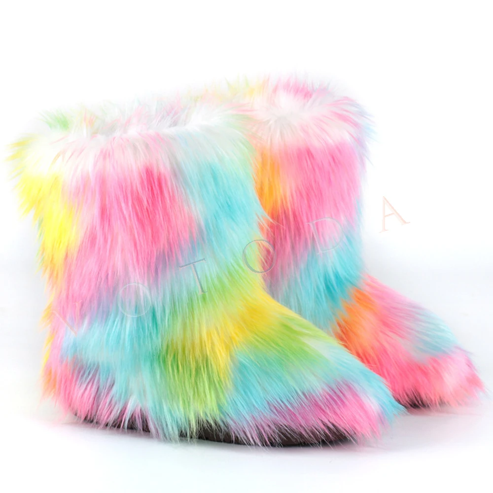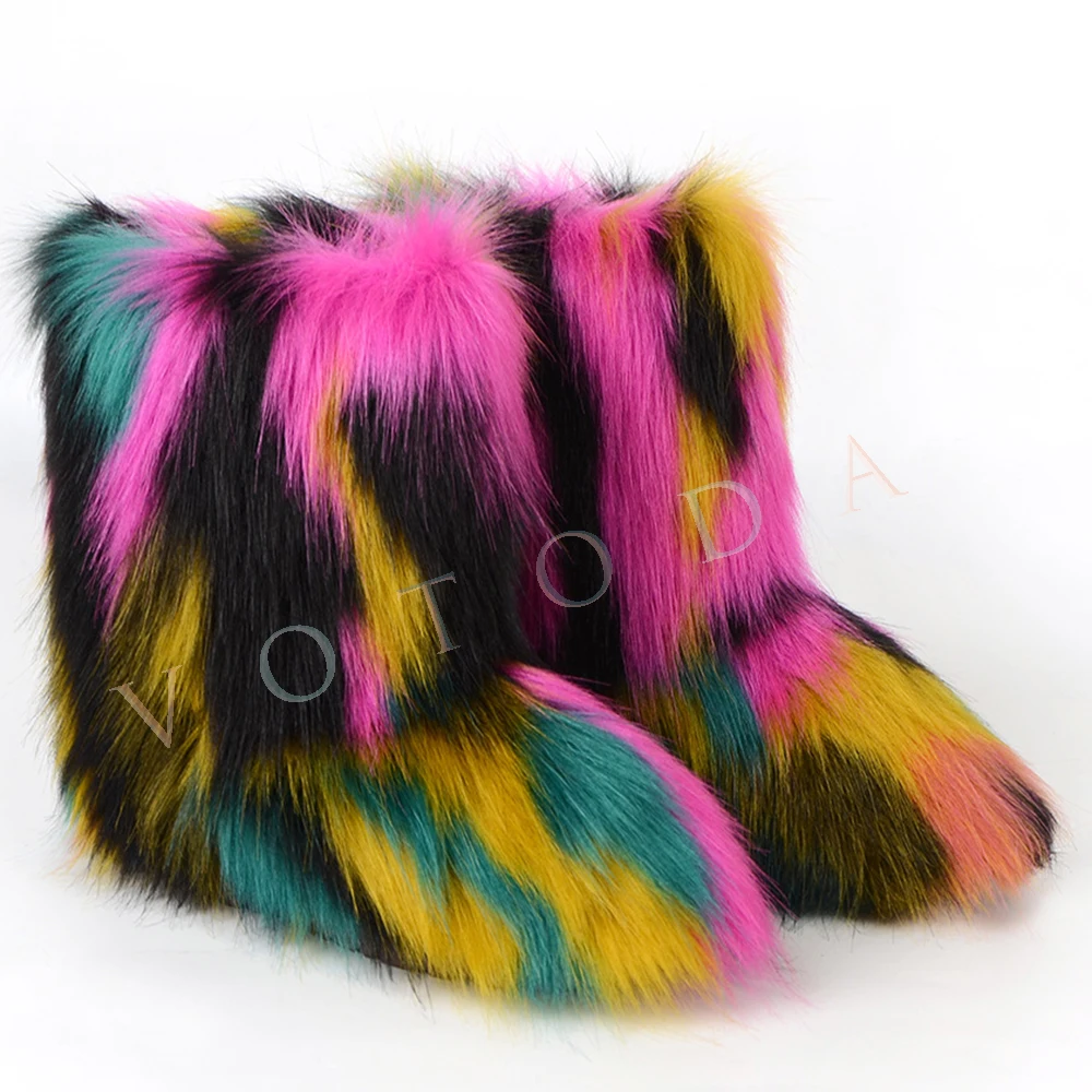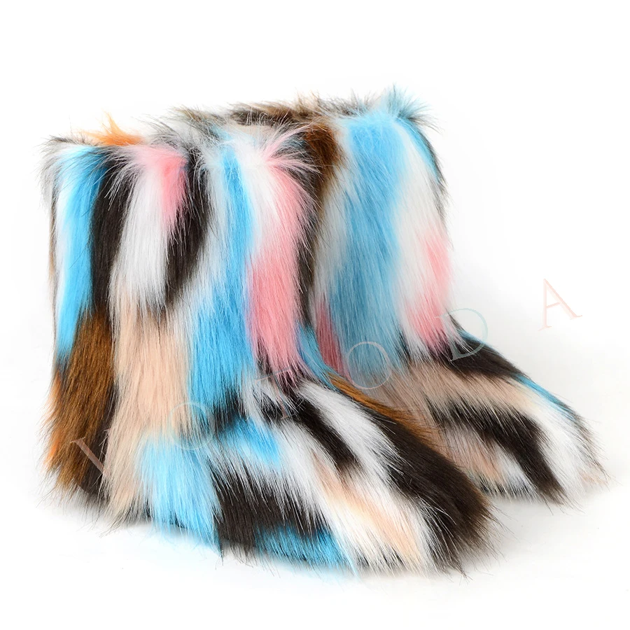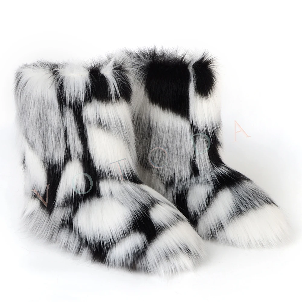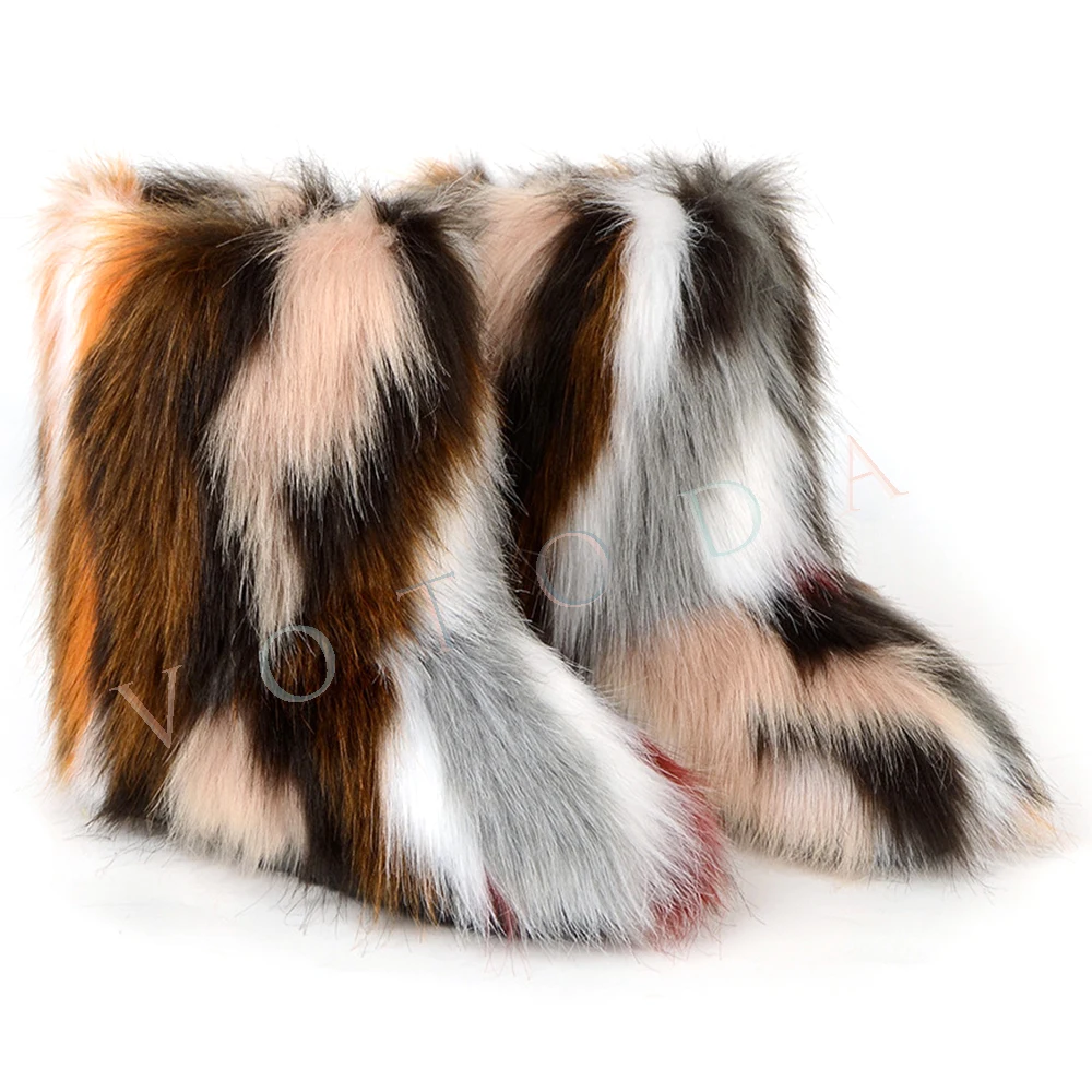 New Winter Women Fur Boots Woman Fluffy Furry Faux Fur Snow Boots Female Plush Outside Flat Shoe Ladies Warm Slip On Ankle Boots