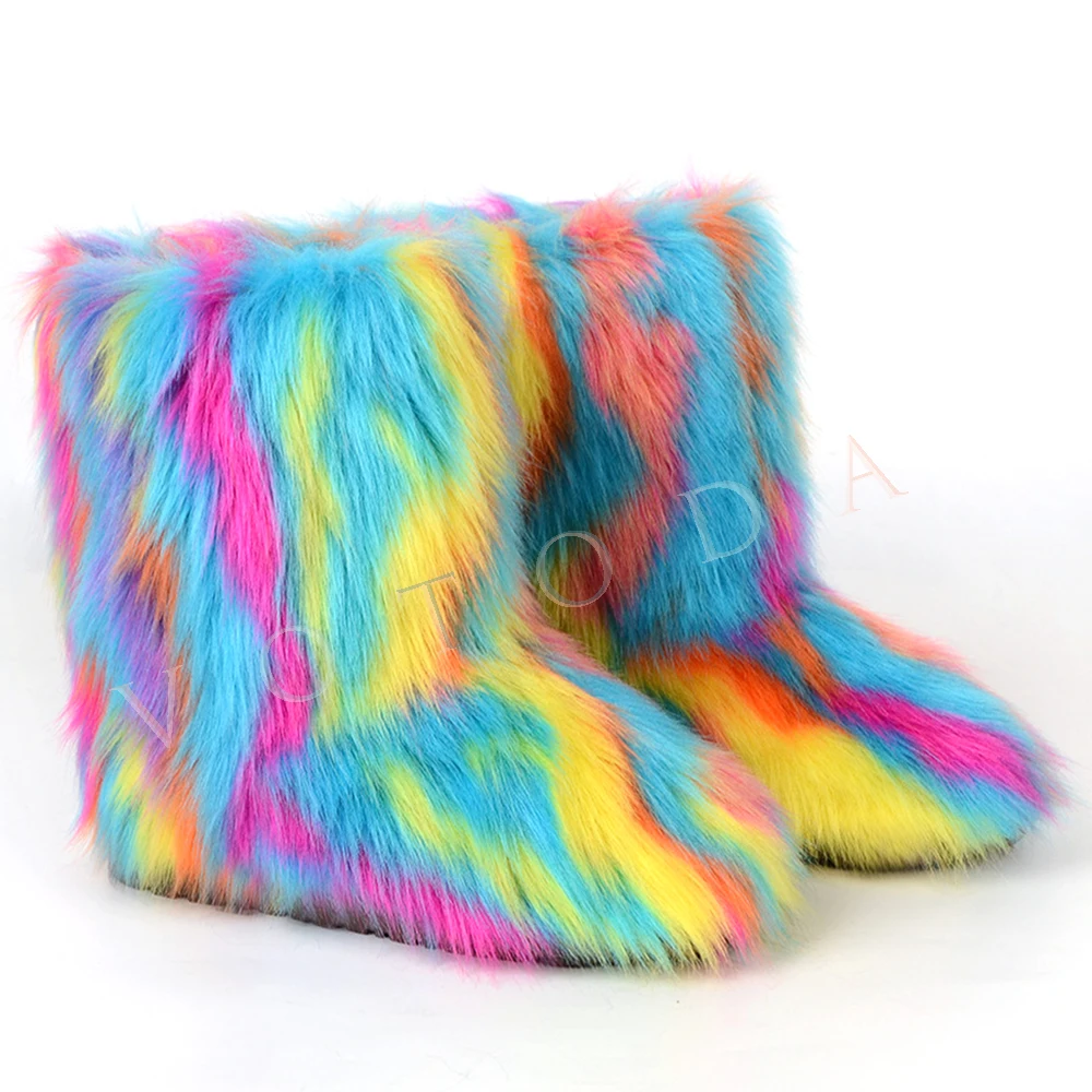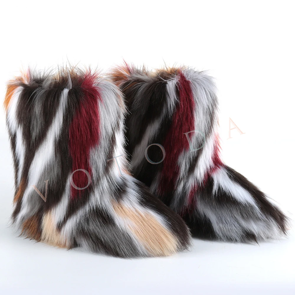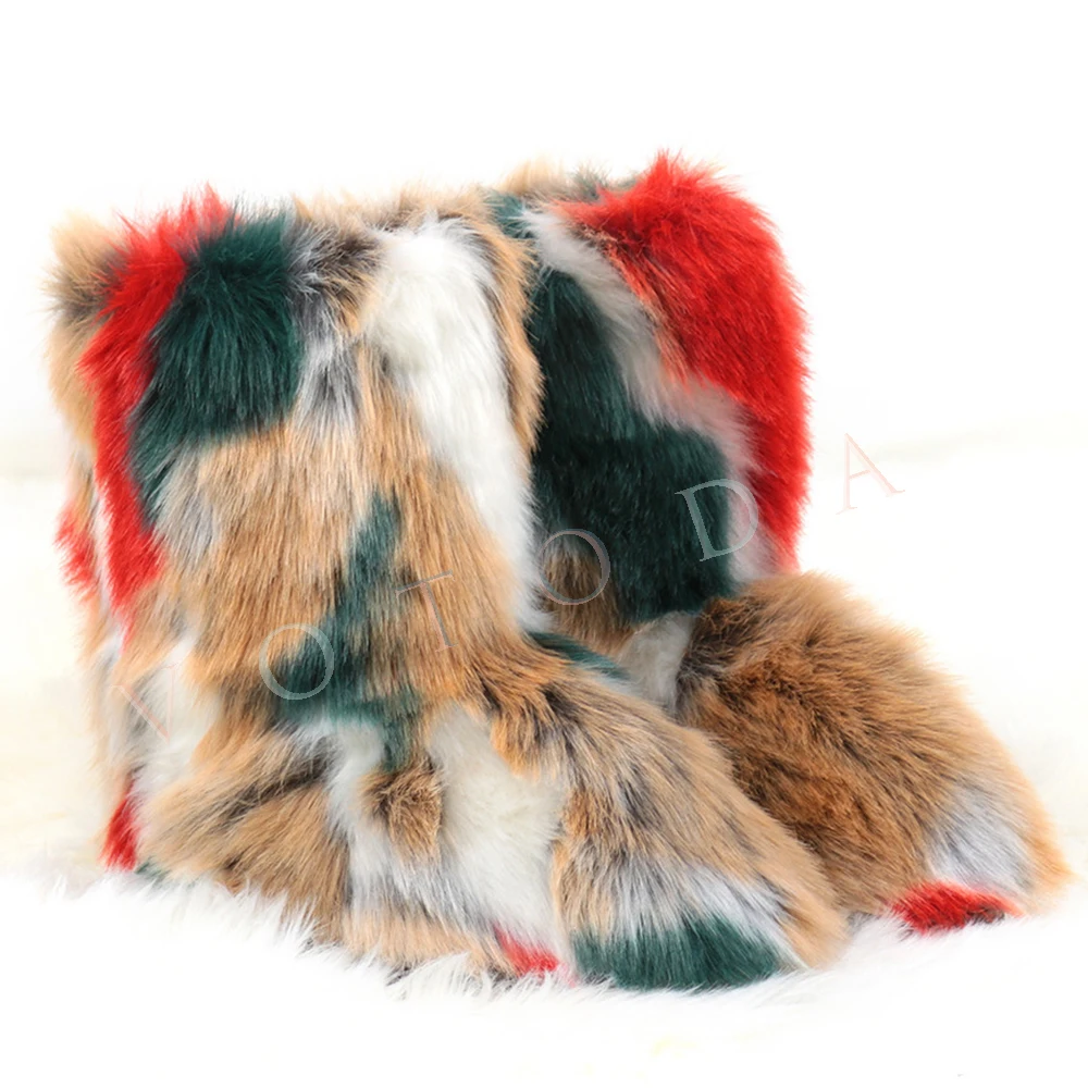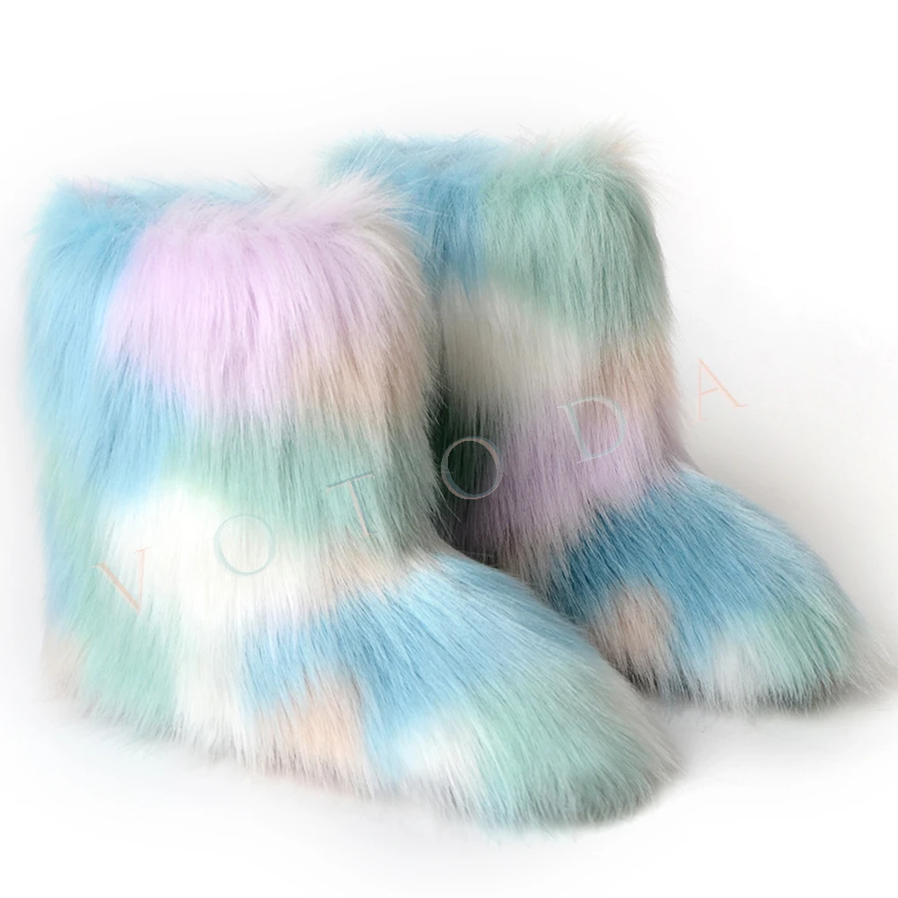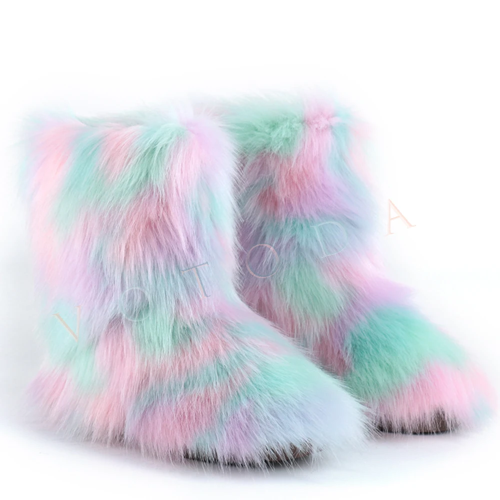 New Winter Women Fur Boots Woman Fluffy Furry Faux Fur Snow Boots Female Plush Outside Flat Shoe Ladies Warm Slip On Ankle Boots