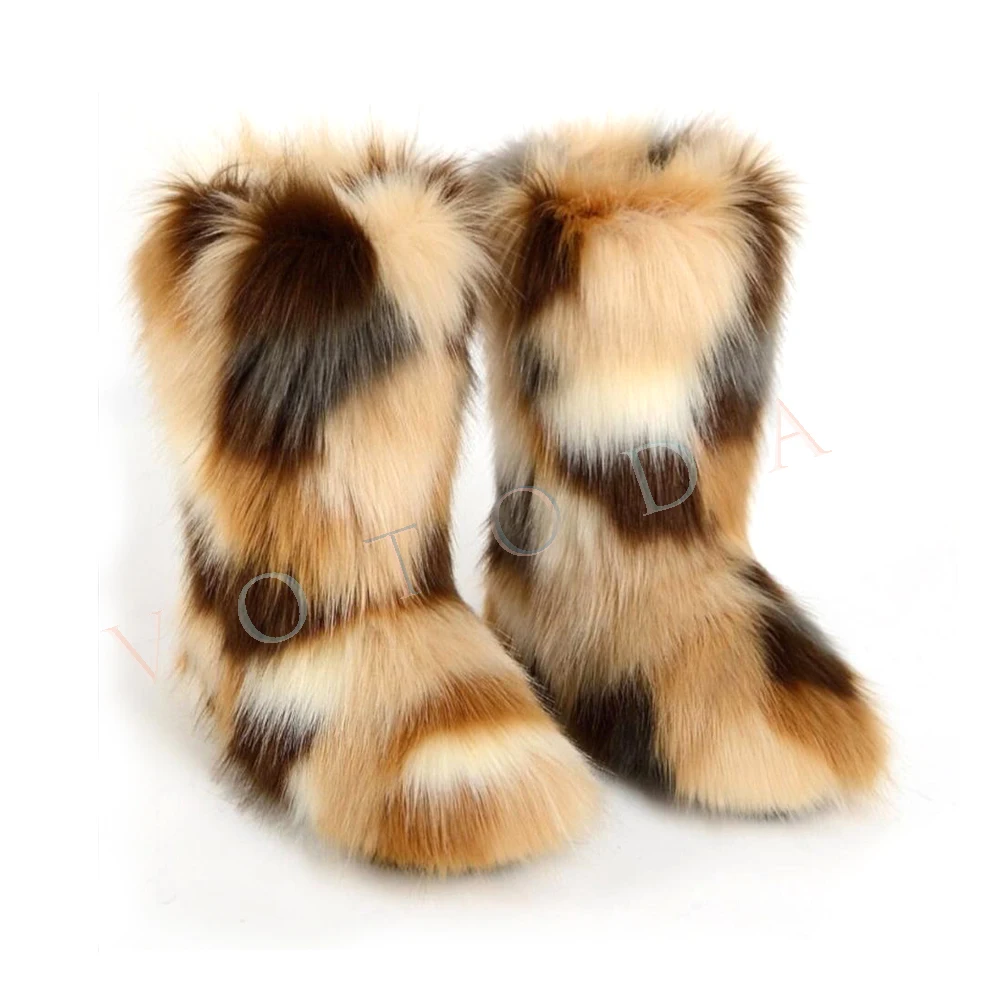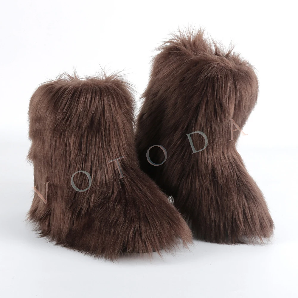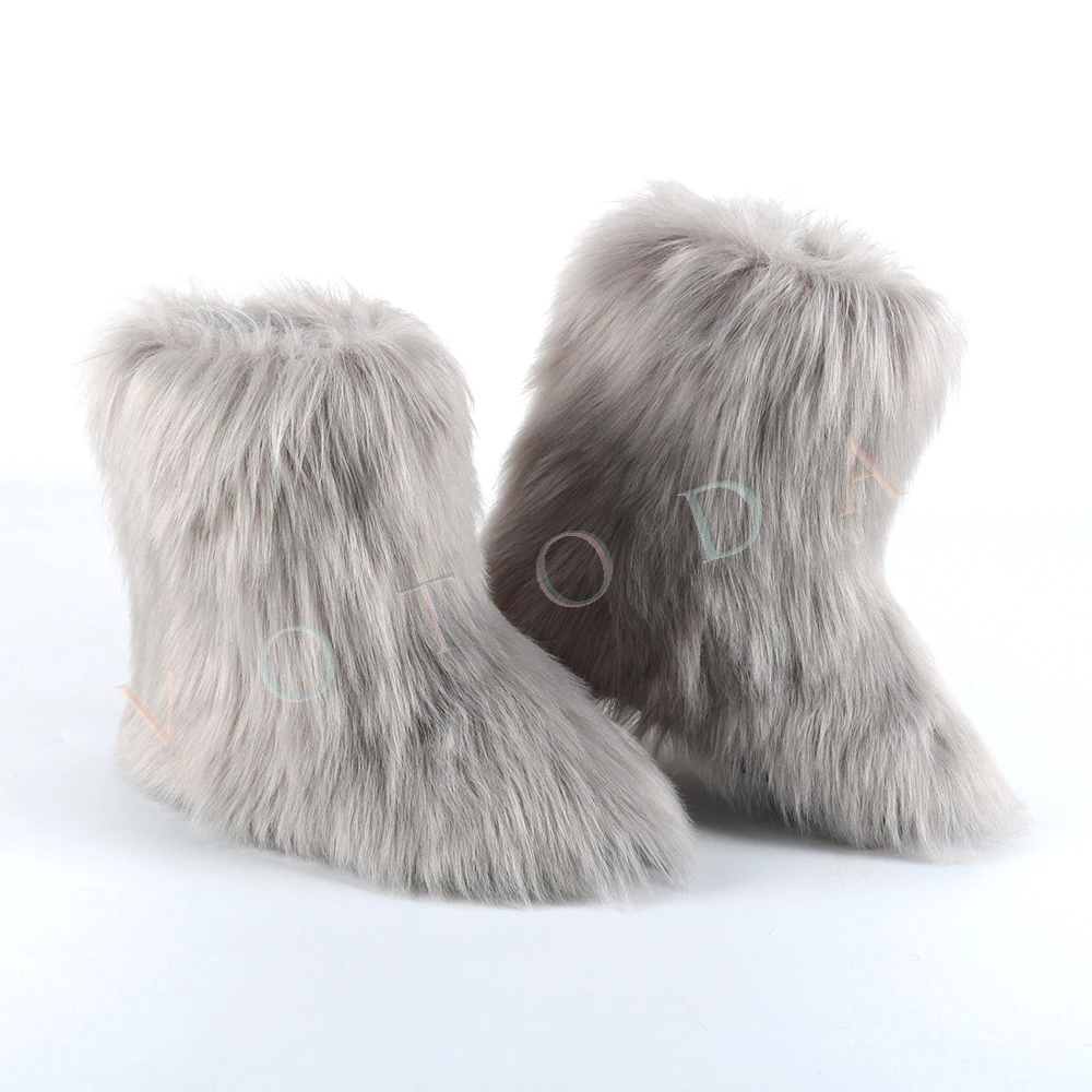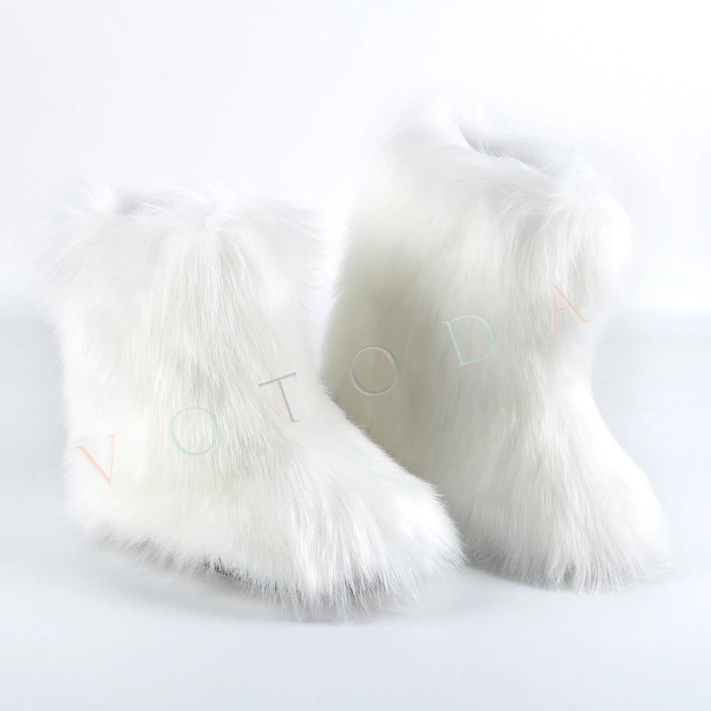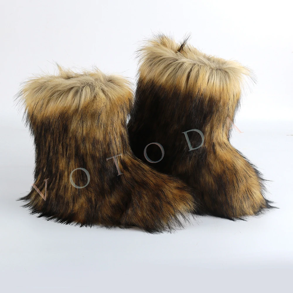 New Winter Women Fur Boots Woman Fluffy Furry Faux Fur Snow Boots Female Plush Outside Flat Shoe Ladies Warm Slip On Ankle Boots