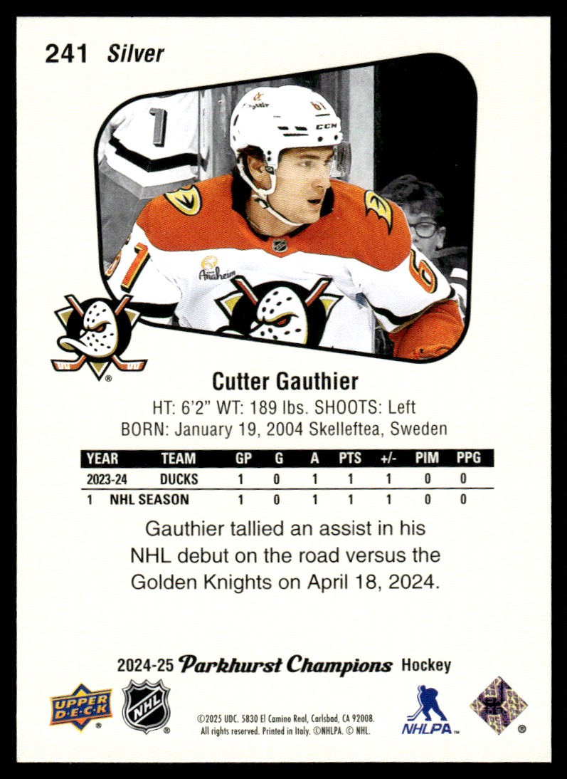 | 2024-25 Parkhurst Champions Cutter Gauthier Rookie Anaheim Ducks #241 Silver |
