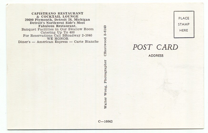 Detroit MI Capistrano Restaurant & Cocktail Lounge Postcard Michigan