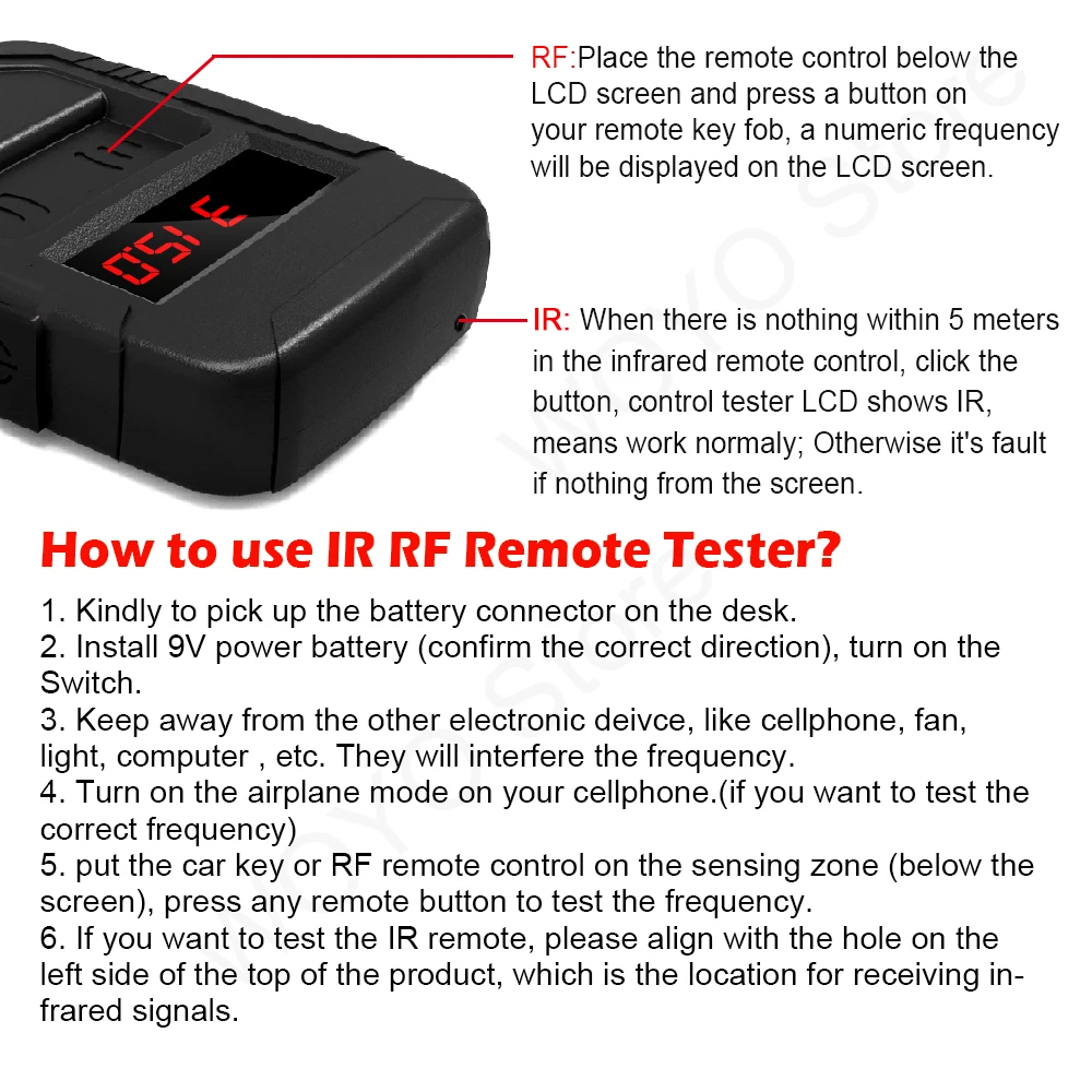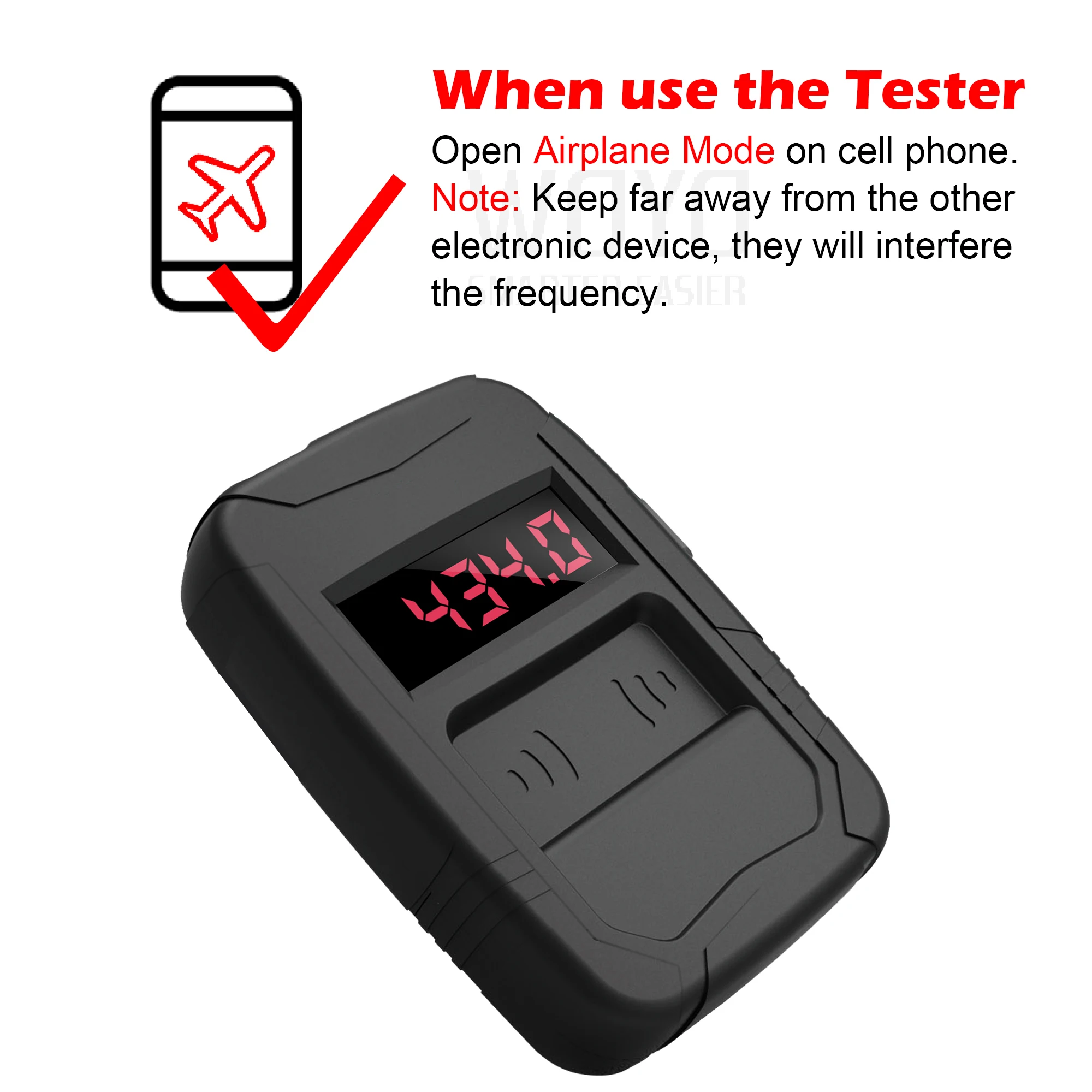 NOTE: When using this frequency tester with a key or remote control, please remove other products that may cause signal/frequency interference from the work area at least 1 meter away, such as phones/lights or other products with electronic components.