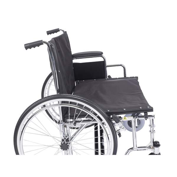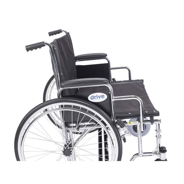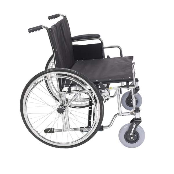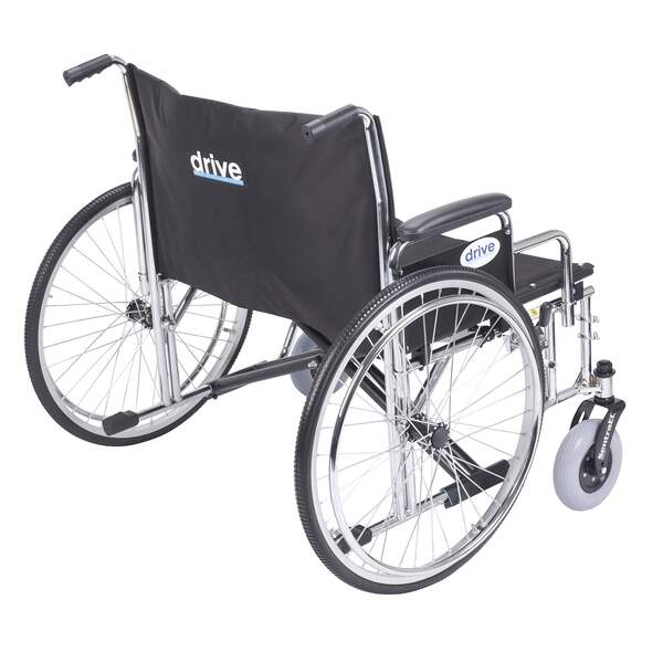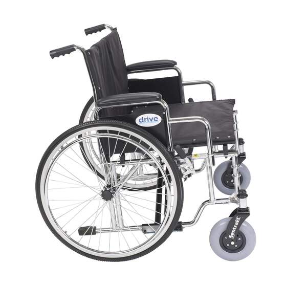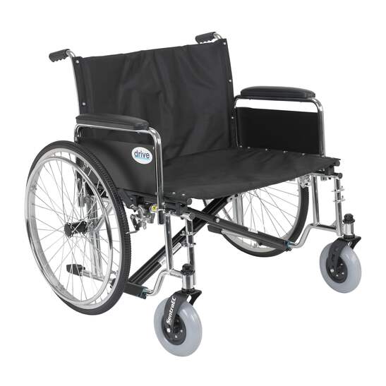 The Sentra EC Extra Wide Heavy Duty Wheelchair from Drive Medical boasts a 700 pound weight capacity, made possible through the use of reinforced steel gussets, reinforced nylon upholstery, reinforced side frame, extra heavy duty front forks and casters, and dual cross bars. The stylish triple chrome coated steel frame and steel spoke wheels add a touch of elegance to this bariatric wheelchair. Available in various arm styles and seat widths, the right wheelchair exists for you.