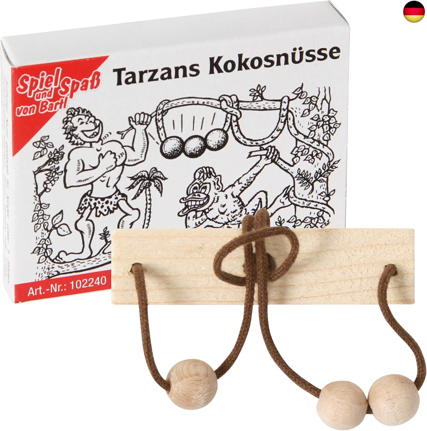 Bartl 102240 Mini-Holz-Puzzle Tarzans Kokosnüsse aus einem Holzbrettchen mit Schnur und 2 Holzperlen