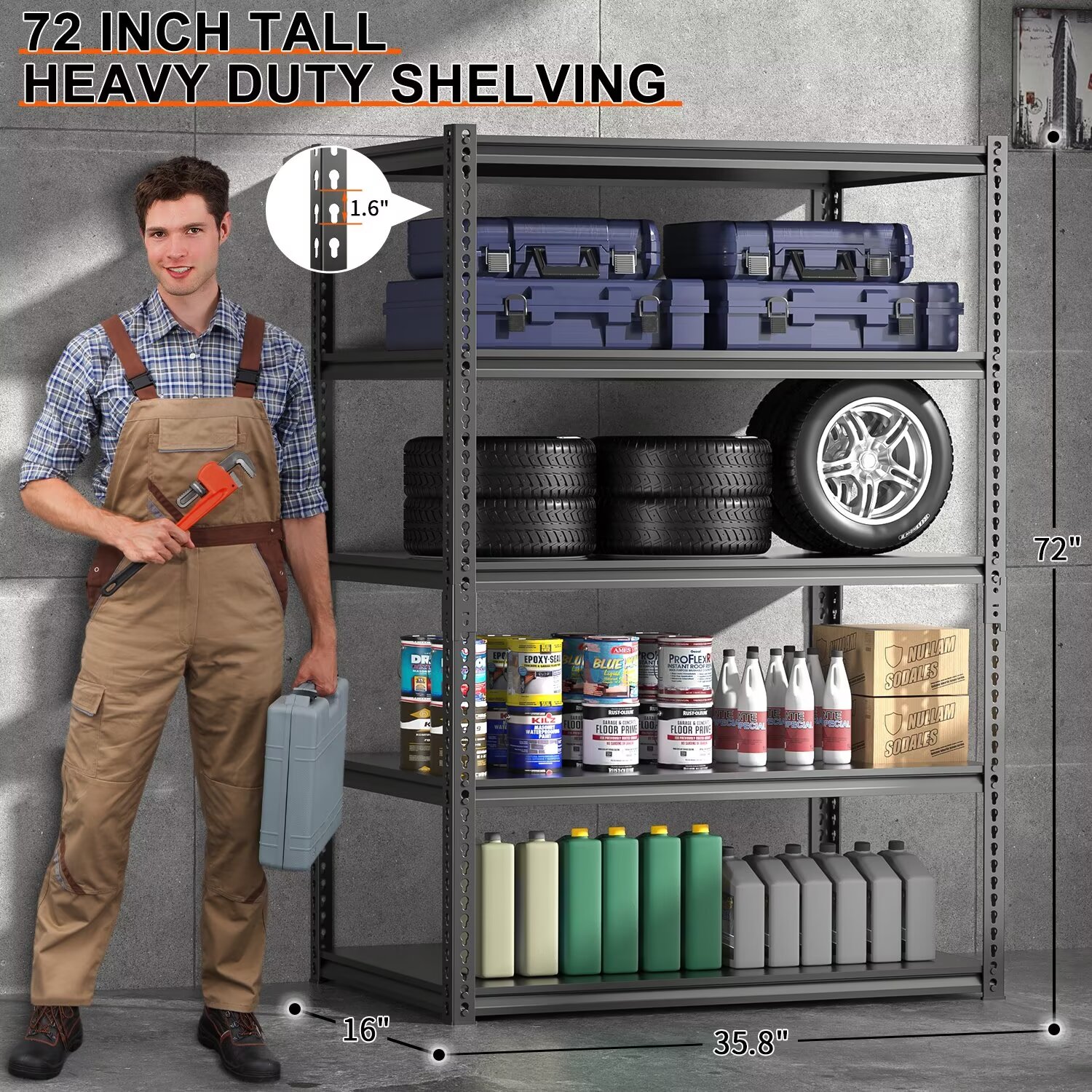 【1000lbs Capacity Storage Shelf】This 5-tier storage shelf can support up to 200LBS per layer, with a total load capacity of up to 1000LBS. Very suitable for storing heavy goods such as tires, engines, cans, etc. For some lighter goods, storage is even easier. The thickened Lightweight MDF frame and partition ensure that the shelves are sturdy and durable.