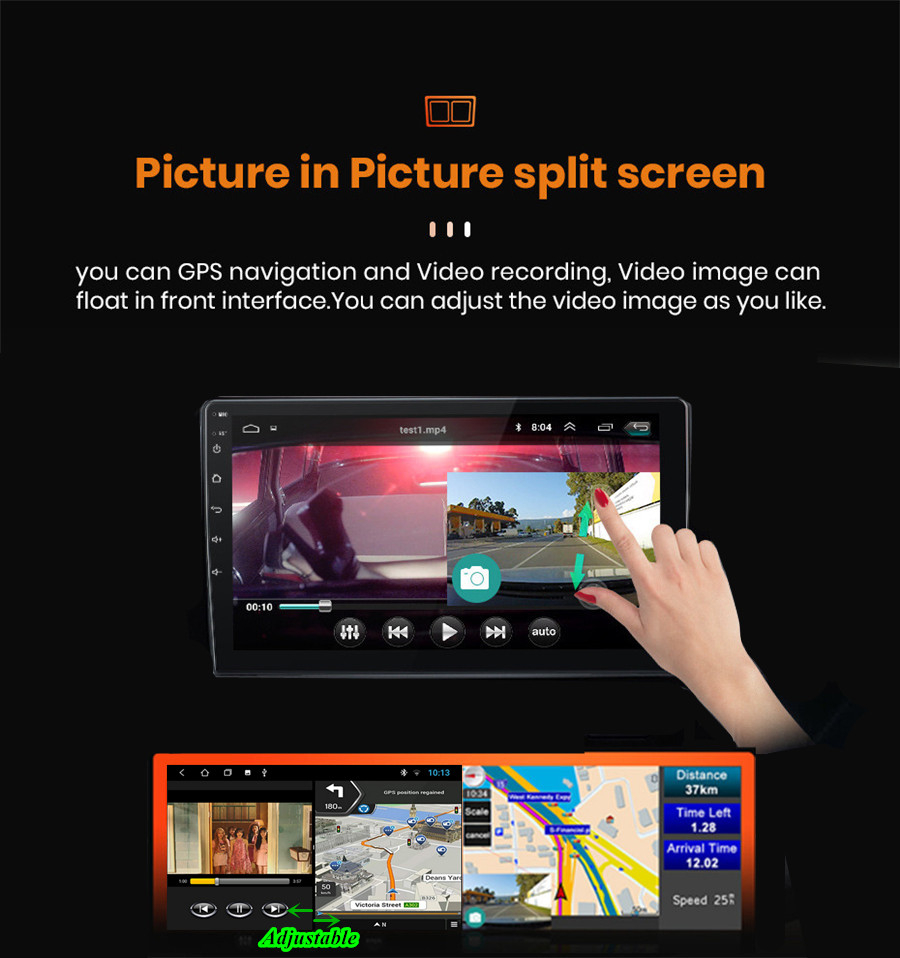 Display | - Touch Screen: Yes - Resolution: 1024*600 - Capacitive or Resistance Screen: Capacitive - Built-in Clock and Calendar: Yes, show real time and can use network-provided time - Main Menu Status Bar display: Can be changed to Music/Radio/BT-Stereo Player and Clock/Date/Week - Change Apps-Icon Position: Yes - Picture in picture split screen:Yes |