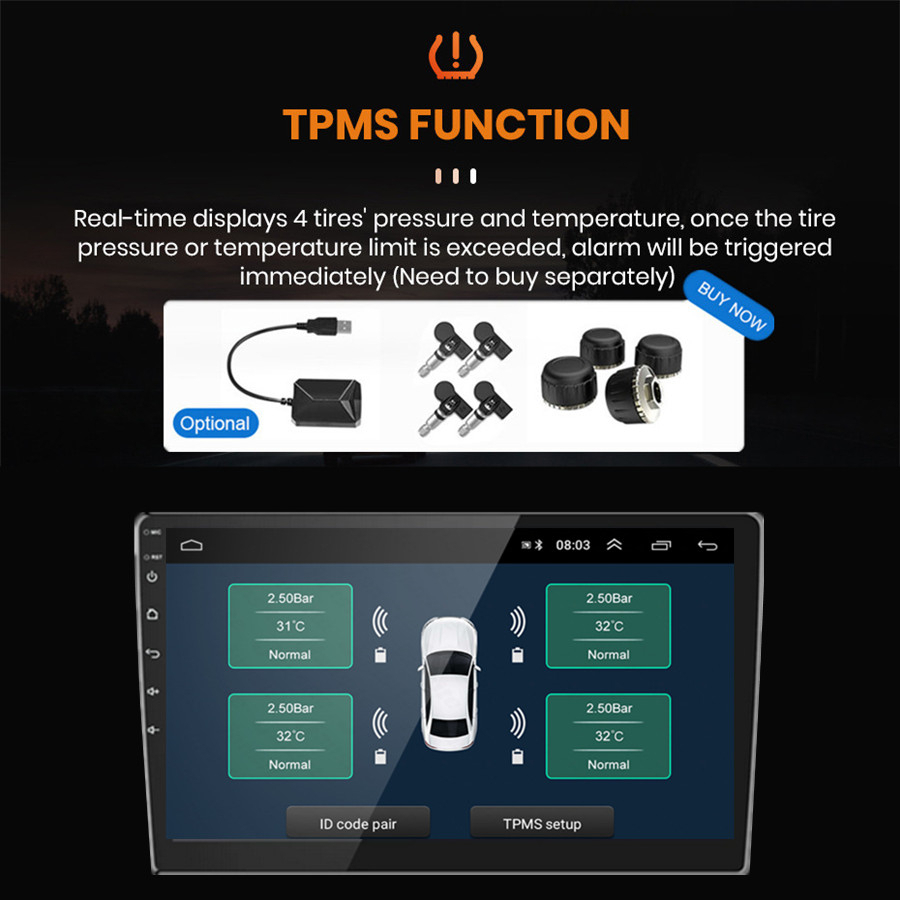 Additional | - Textbook: Could change font, font color, background color, bookmark, reading E-book while listening music - Photo Viewer: Support JPS, BMP, PNG, GIF etc. format. play by revolve, Powerpoint Support 4096*4096 Pixels - Wallpapers: 5 live wallpapers, 17 standard wallpapers, support DIY wallpaper from Gallery - APK Installer: Support Android Package installer - Support Torque Pro(OBD2 &Car): Yes, you can connect a Bluetooth OBD2( Bluetooth version ≥ 4.0 ) Scanner Tool to use this function - Support Mirror Link function: Yes, support WIFI/USB screen mirroring from iPhone and android smartphone - Support TPMS: YES (Not Included) -Support Steering Wheel Control;Yes |
