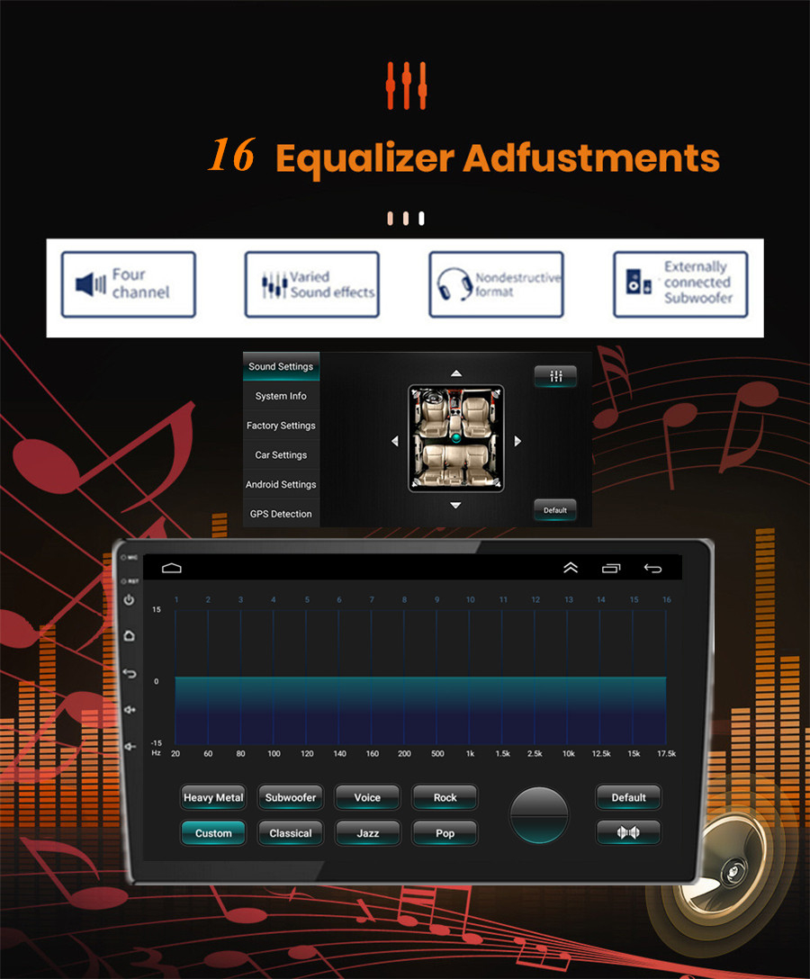 Setup | - WiFi/Hotspot/Bluetooth: Yes - Brightness level adjustable: Yes - Wallpaper: Wallpapers/Live Wallpapers/Gallery - Sound: Key Tone & Volume - Storage: Display Internal Storage/Nand Flash/Connected Device Storage - Apps: Running Apps display/force stop/uninstall - Security: Yes - Accounts: Yes - Languages and Input: more than 70 Languages and choose input method - Backup and Reset: Yes - Date and Time: Setting Date&Time by yourself or choose GPS/network-provided time - Accessibility: Yes - GPS: Yes, GPS application options/monitoring/sound mode/mixing ratio - Driving safety: Watching Video, Reversing X-mirror/Volume, Reversing Trajectory/radar Display, Rear view ruler - Amplifier: Rock/Pop/Jazz/Classic/Flat/Voice/Custom - Steering Wheel Control: Yes - About Device: Display Parameter Info. |