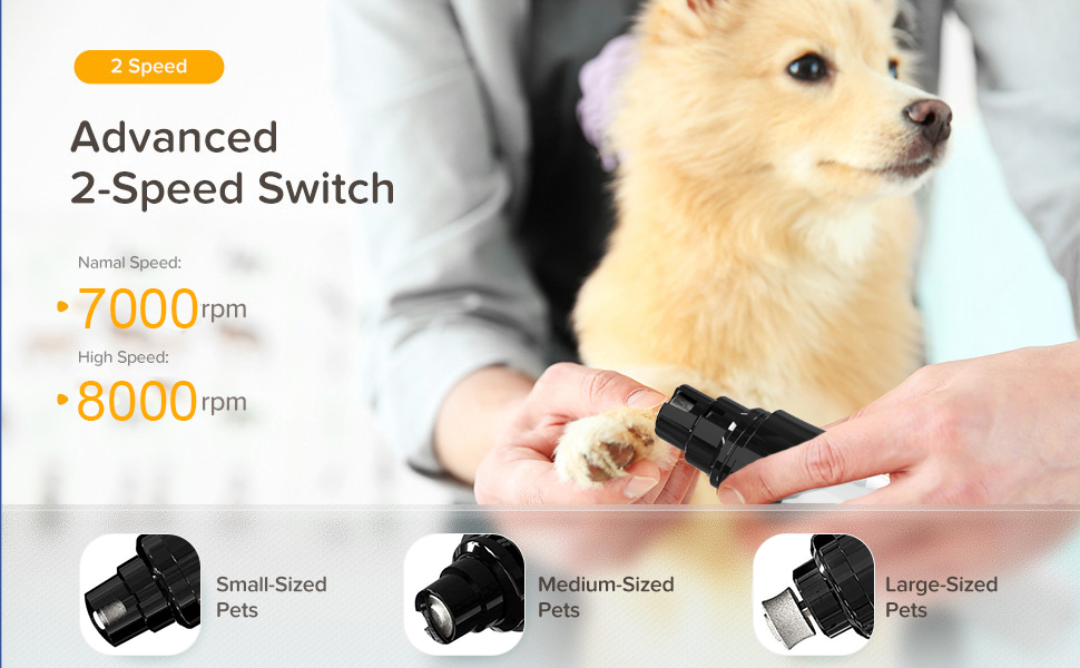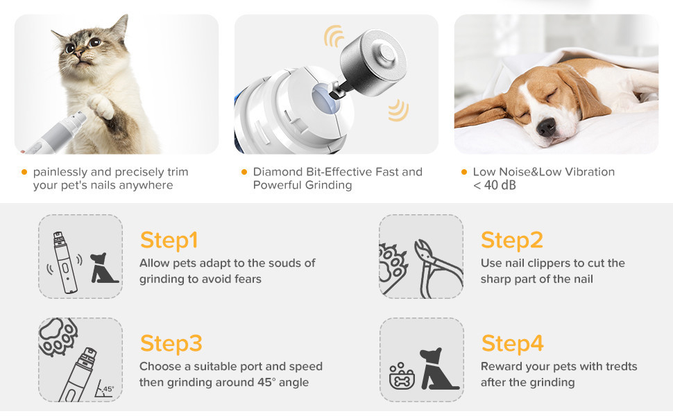 【 Reduce Pet Anxiety 】The dog nail grinder quiet is equipped with a specially designed motor that produces a noise level of around 45db. The sound may be slightly louder during nail polishing, but compared to other products, our dog nail grinder significantly reduces the noise that may cause dog anxiety and stress during nail trimming, ensuring that you can smoothly beautify your pet while also providing a comfortable experience.