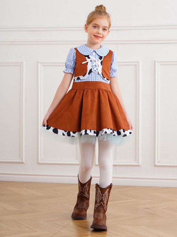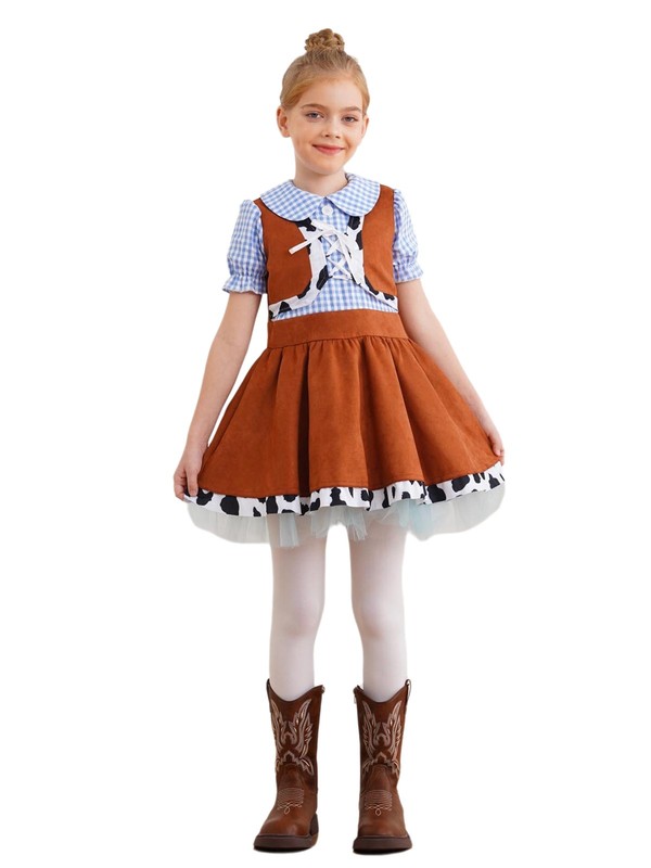 Decorated with cow print and gingham pattern, this dress is great to match with cowboy hat, boot for a complete cowgirl look.