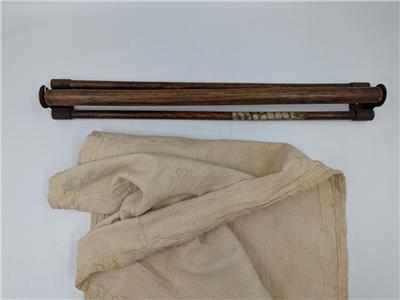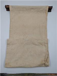 Metal brackets on the end of two wood rods in the back for mounting to the wall have arms that extend out, so the rotating rod is attached for the “infinity” towel to be hung on it. When towel is used, it is pulled to bring about the dry towel from the back while the recently used one then dries. Hanging rod attached at one end and sets into a slot on the other end so towel can be removed for laundering. Included towel is cotton. The unit measures 18.5” overall and the towel is 14.5” wide and 68” long.