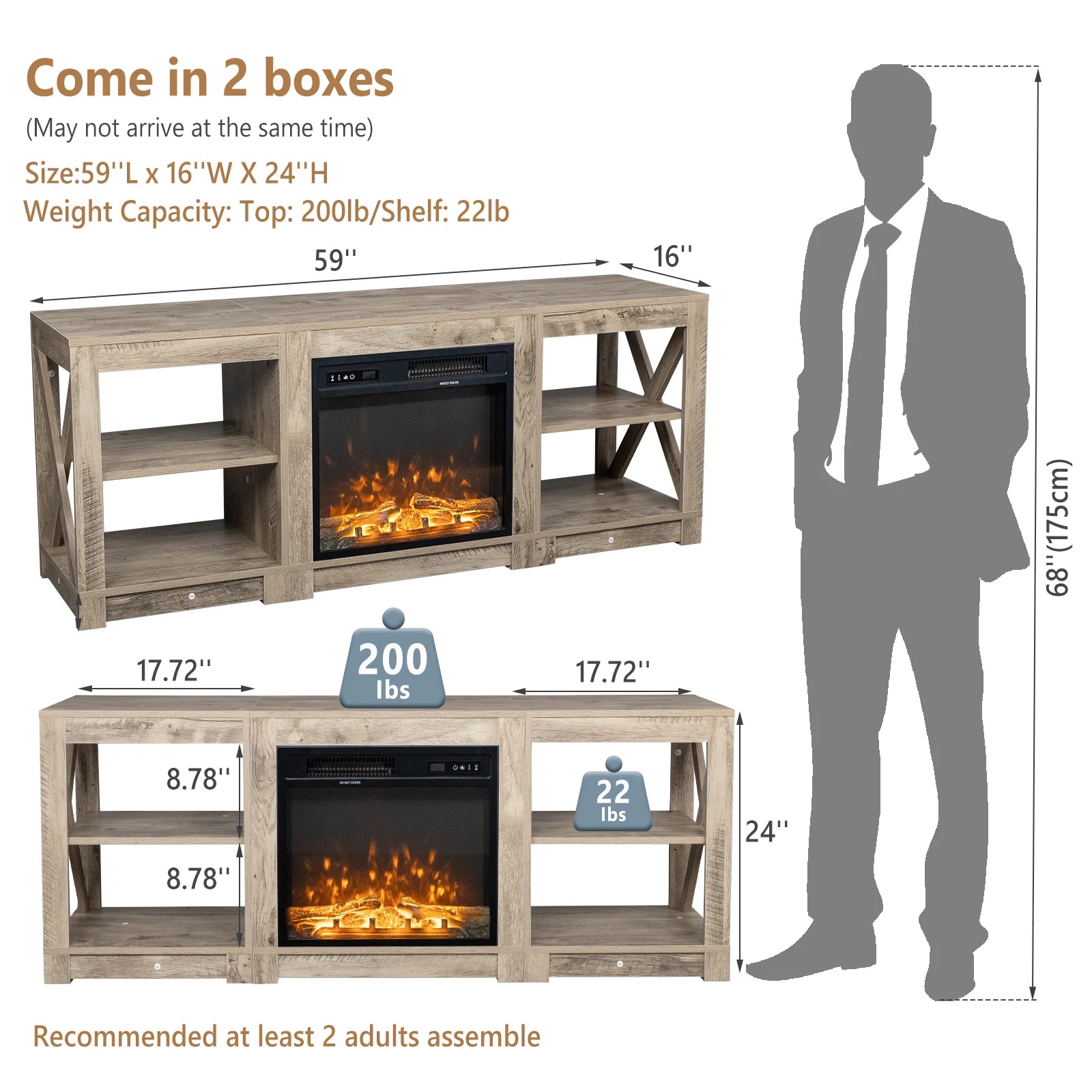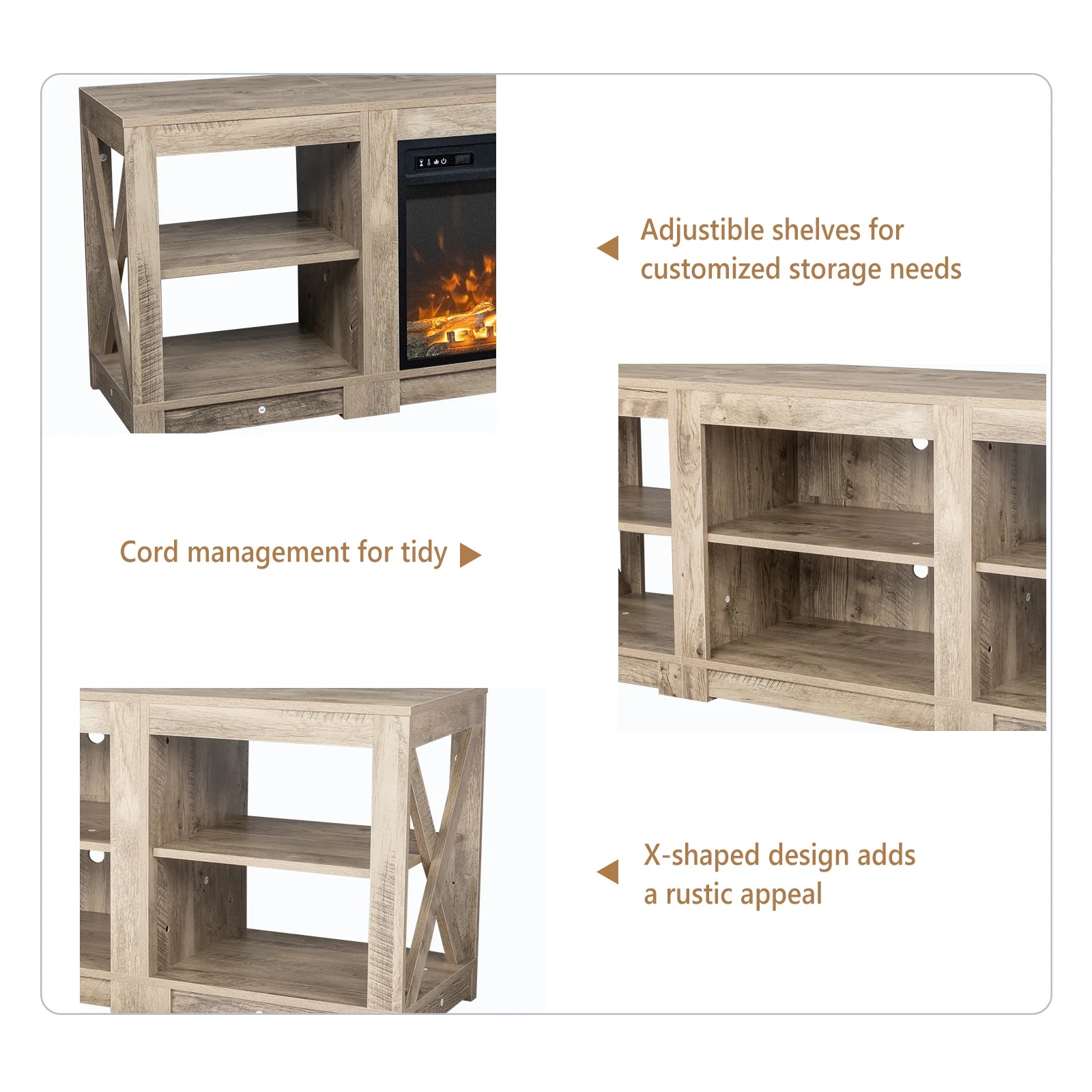 【MODERN FARMHOUSE STYLE】With X-Design side decor, Oak finish gray color, this entertainment center with fireplace will help you create a farmhouse cozy ambience in your living room, and enjoy a warming winter.