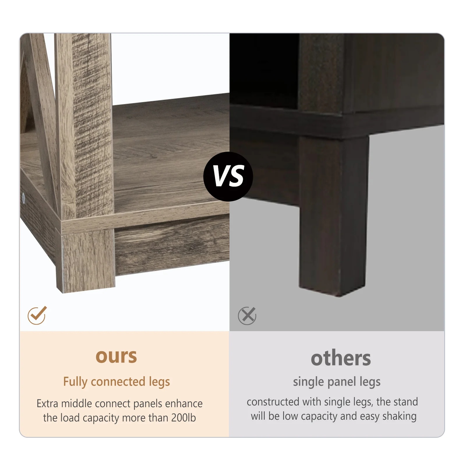 【PREMIUM MATERIAL & SOLID CONSTRUCTION】This mid century modern tv stand is mainly made by P2 MDF; There are extra horizontal panels to connect all 4 legs as a whole unit, and enhance the load capacity above to 200lb.