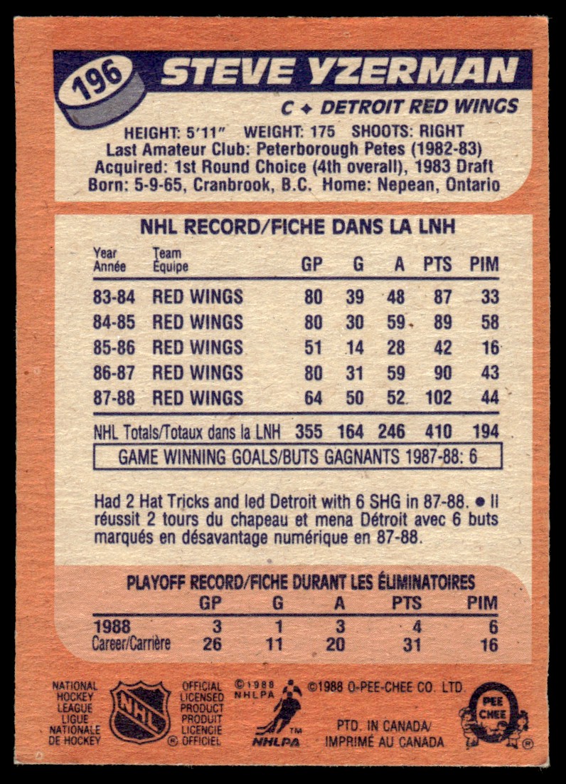 | 1988-89 O-Pee-Chee Steve Yzerman Detroit Red Wings #196 |