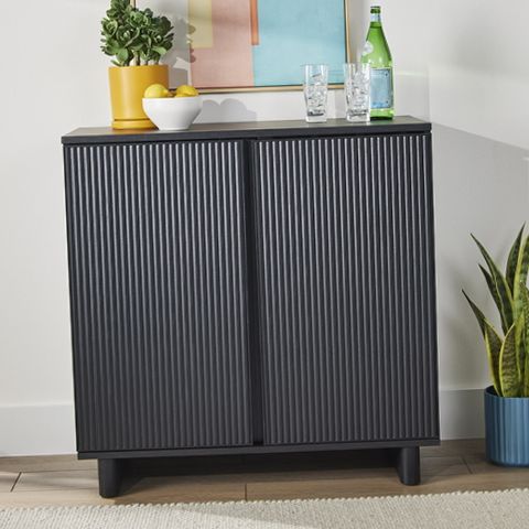 This Better Homes & Gardens Lillian Fluted bar cabinet for adult has clean lines and a timeless design that will revitalize any space. Designed with slow-close hinges, it features adjustable shelves and wine storage. The top of the cabinet is perfect for serving drinks or displaying your favorite decor items. The flat surface ensures stability while pouring drinks, making it easy to entertain guests in style. This wine cabinet is not only functional but also durable. The sturdy construction ensures long-lasting use.The top surface can hold 50 lbs,each shelf can hold 30 lbs.