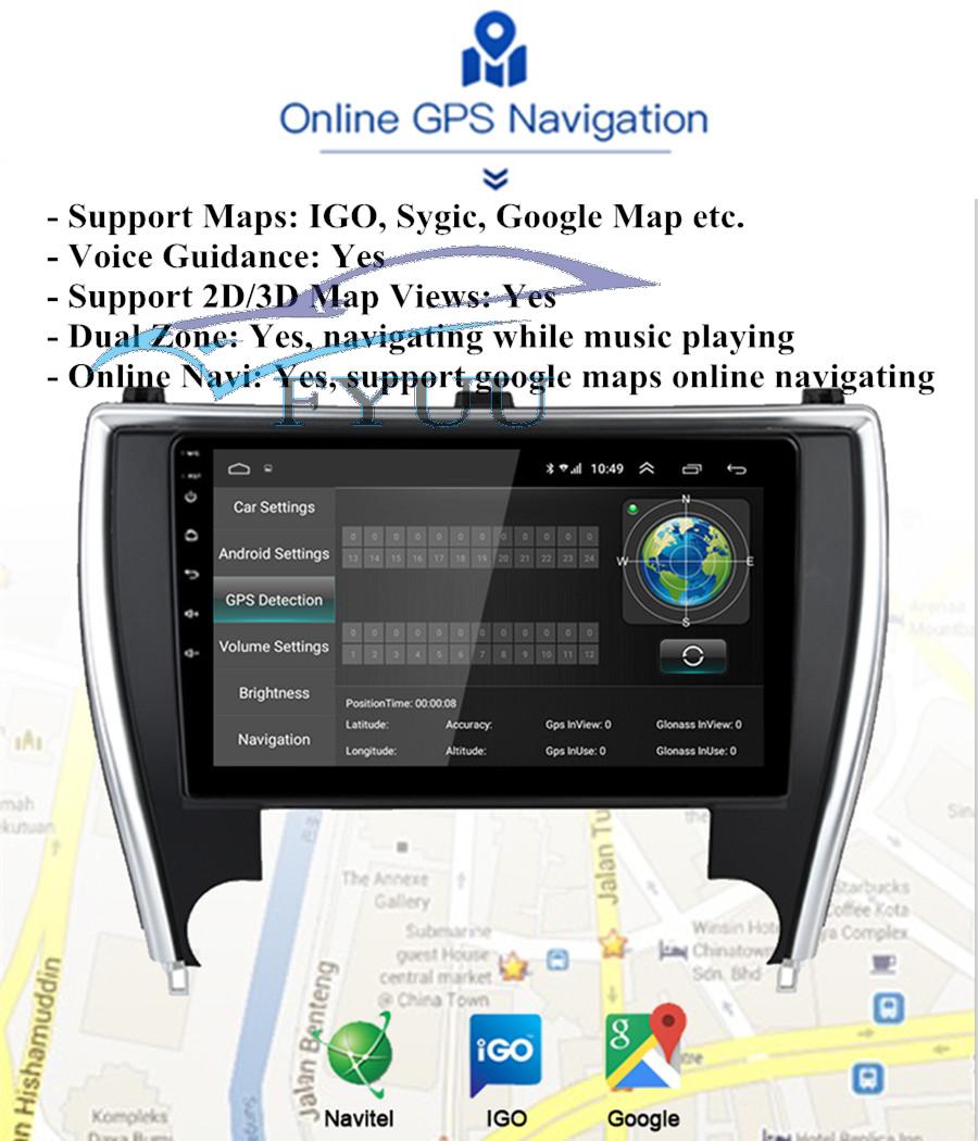 GPS | - Operation System: Android 10.1 - Support Maps: IGO, Sygic, Google Map etc. - Voice Guidance: Yes - Support 2D/3D Map Views: Yes - Dual Zone: Yes, navigating while music playing - Online Navi: Yes, support google maps online navigating |