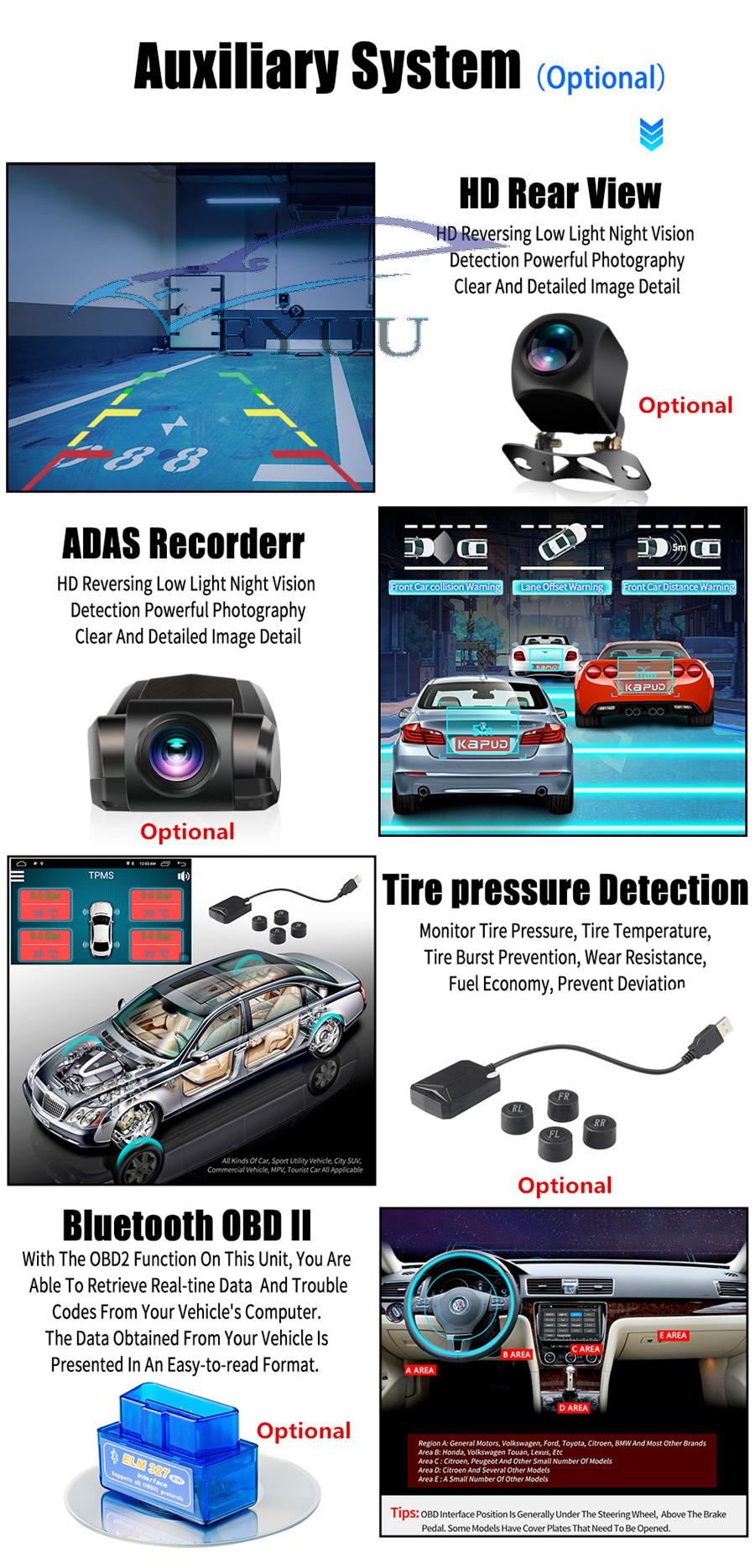 Additional | - Textbook: Could change font, font color, background color, bookmark, reading E-book while listening music - Photo Viewer: Support JPS, BMP, PNG, GIF etc. format. play by revolve, Powerpoint Support 4096*4096 Pixels - Wallpapers: 5 live wallpapers, 17 standard wallpapers, support DIY wallpaper from Gallery - APK Installer: Support Android Package installer - Support Torque Pro(OBD2 &Car): Yes, you can connect a Bluetooth OBD2 Scanner Tool to use this function - Support Mirror Link function: Yes, support screen mirroring from iPhone and android smartphone - Support TPMS: YES (Not Included) |