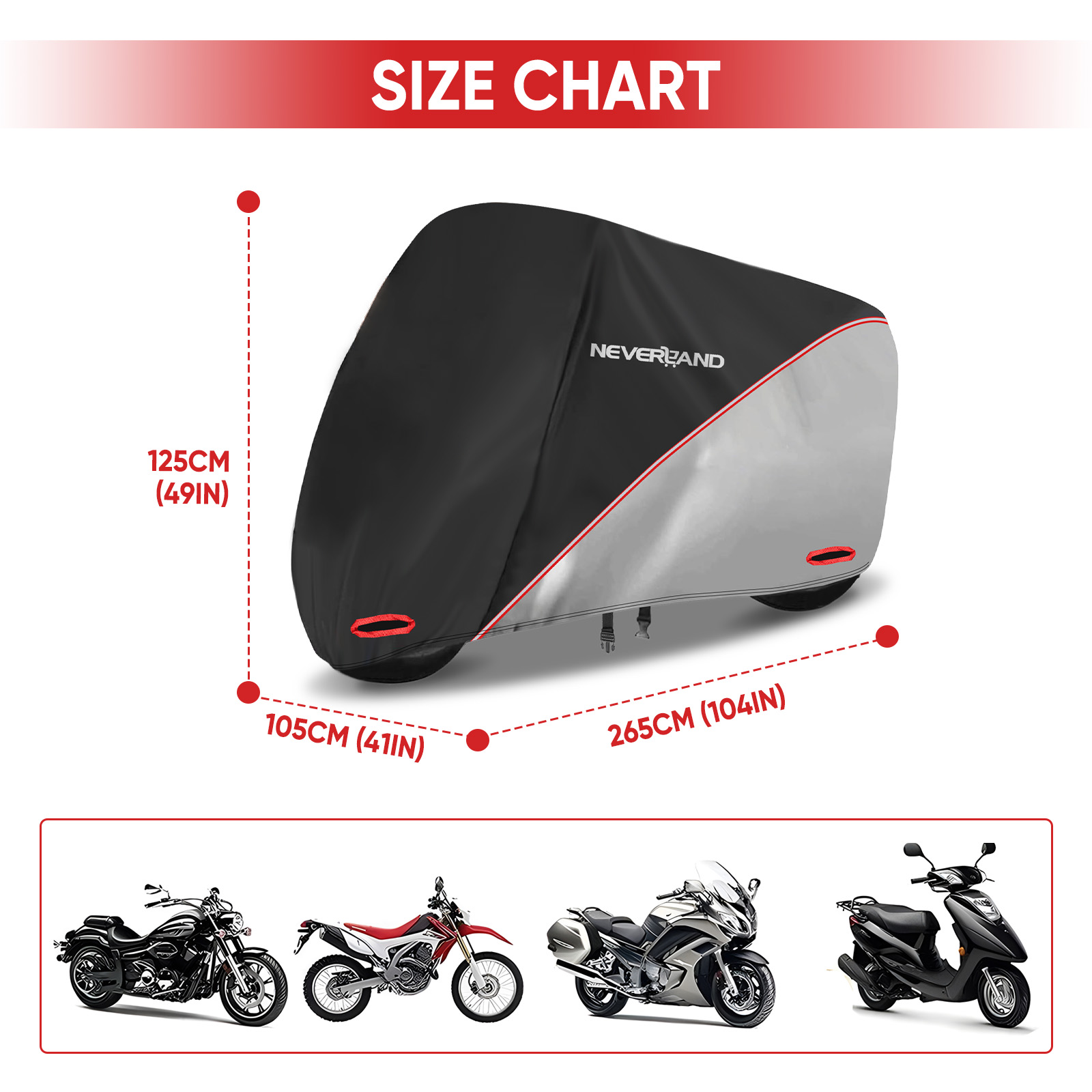 【Extended Reflective Strips】 - There are two extra long reflective strips around the motorcycle body. Waterproof motorcycle cover improves safety when parking at night. Adjustable straps, reinforced buckles, strong windproof ability.