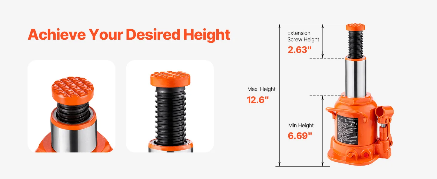 Adjustable Height: With a lifting range of 6.69–12.6 inches (170–320 mm), this hydraulic welded bottle jack offers flexibility for different vehicle chassis heights. The screw is adjustable by 2.4 inches (60 mm), making it adaptable for various lifting tasks.