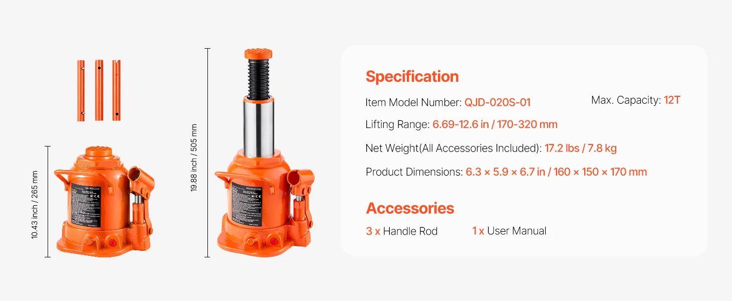 Upgraded 3-Section Handle: The 3-section handle provides extra leverage, making it easier to lift heavy loads with the automotive welded hydraulic bottle jack. Whether you're a professional or a DIY enthusiast, this bottle jack is perfect for lifting vehicles. It’s also compact and easy to store in your trunk or garage.