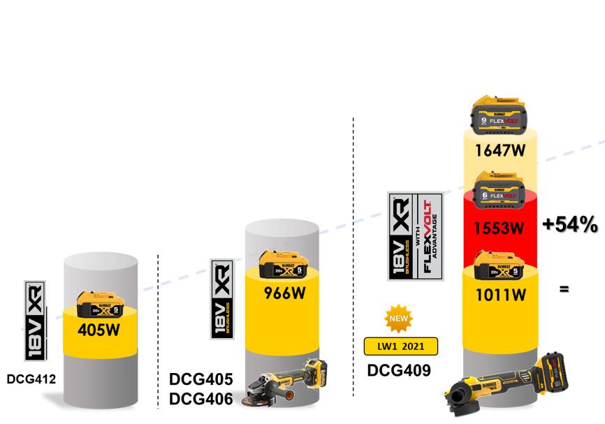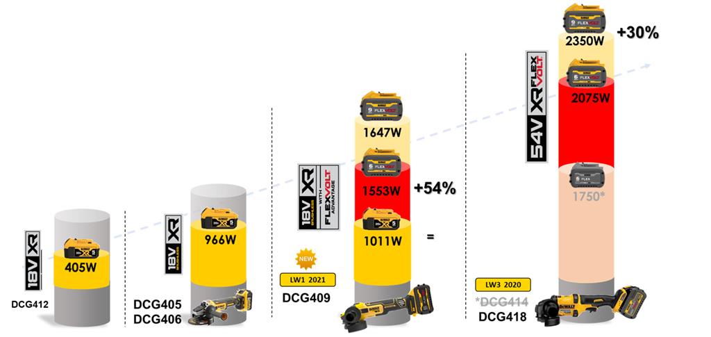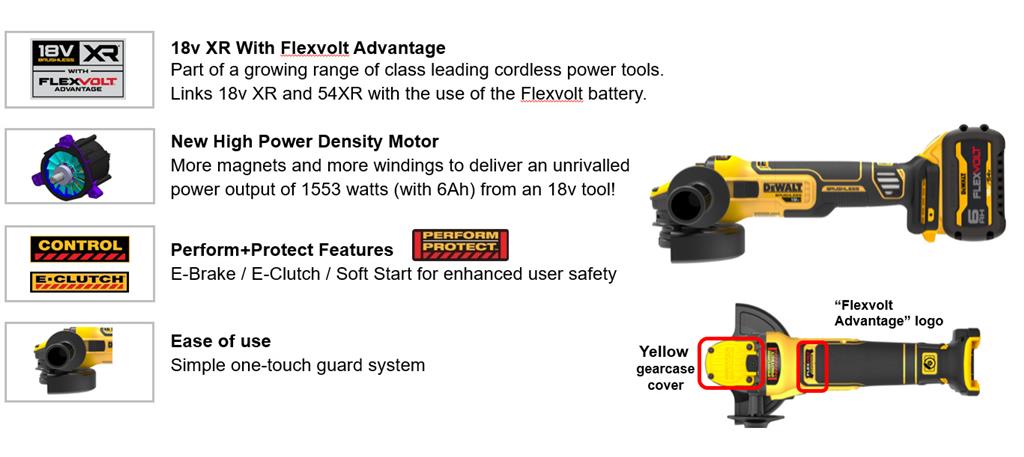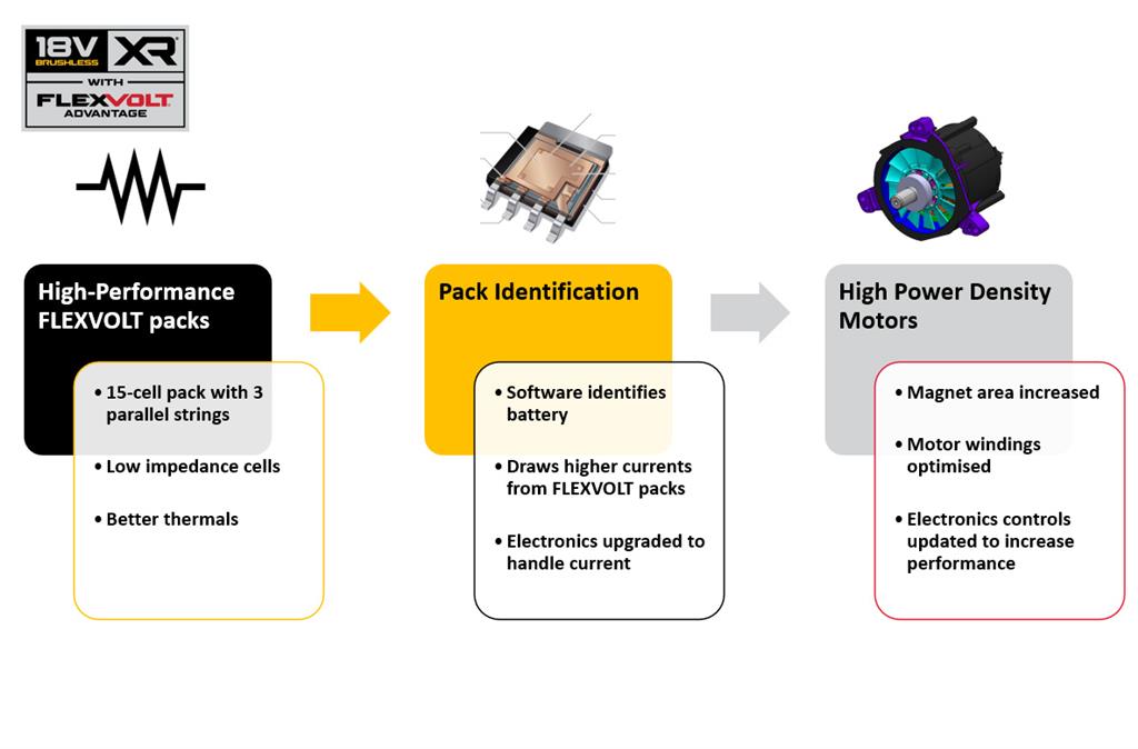 Dewalt 18v XR tools featuring Dewalt Flexvolt Advantage technology include a brand new electronic module which recognises Flexvolt batteries to deliver more power than with standard 18v XR batteries. The Flexvolt Advantage machine can then draw more current and adjust the power output accordingly. This means that when you use a high performance XR FLEXVOLT battery pack with a FLEXVOLT ADVANTAGE tool, as opposed to a standard 18v battery, you get much more power! These new machines also include new brushless motors with stronger magnets and increased copper in the outer windings.