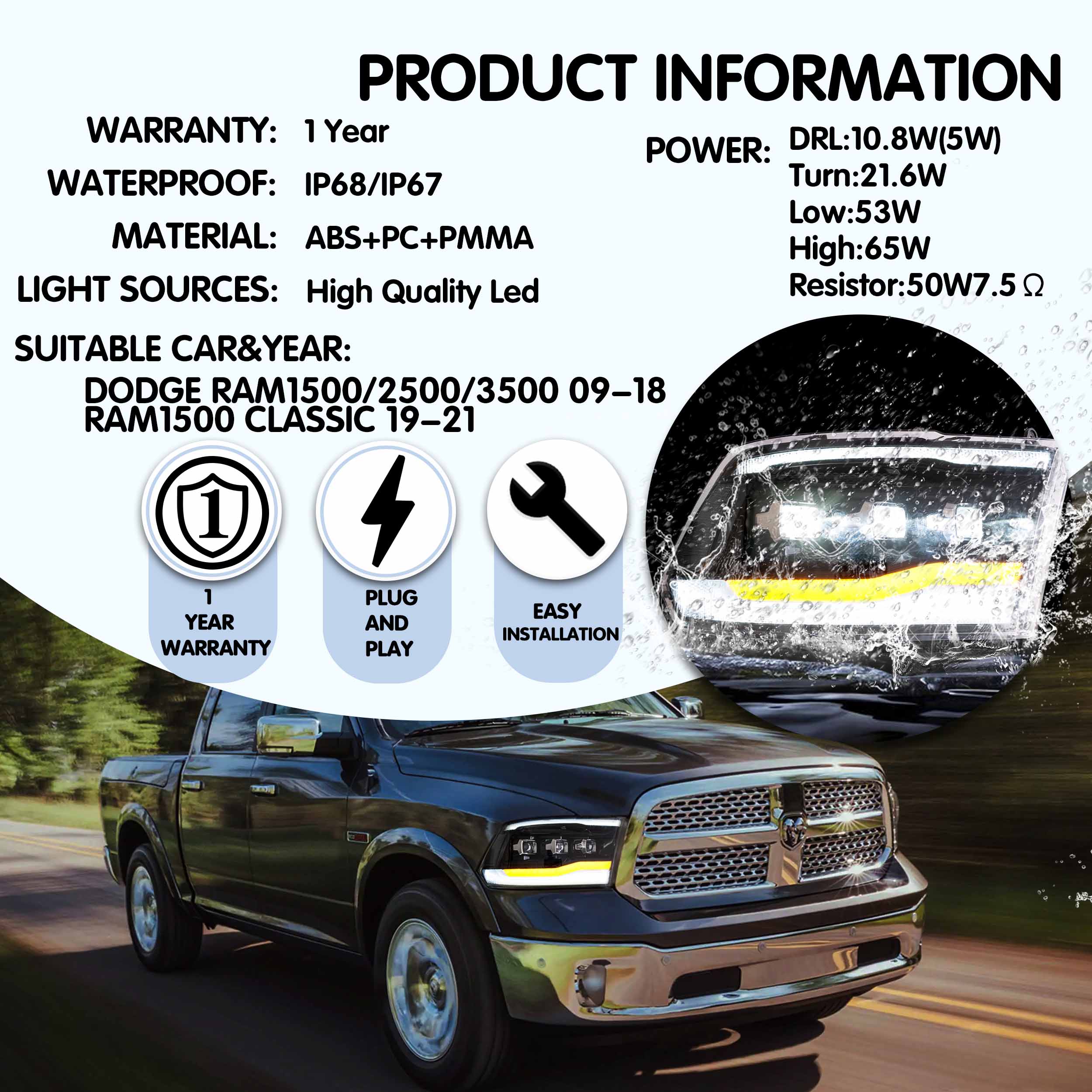 Fitment:for 2009-2018 Dodge RAM 1500/2500/3500.2019-2021 Dodge RAM 1500 Classic