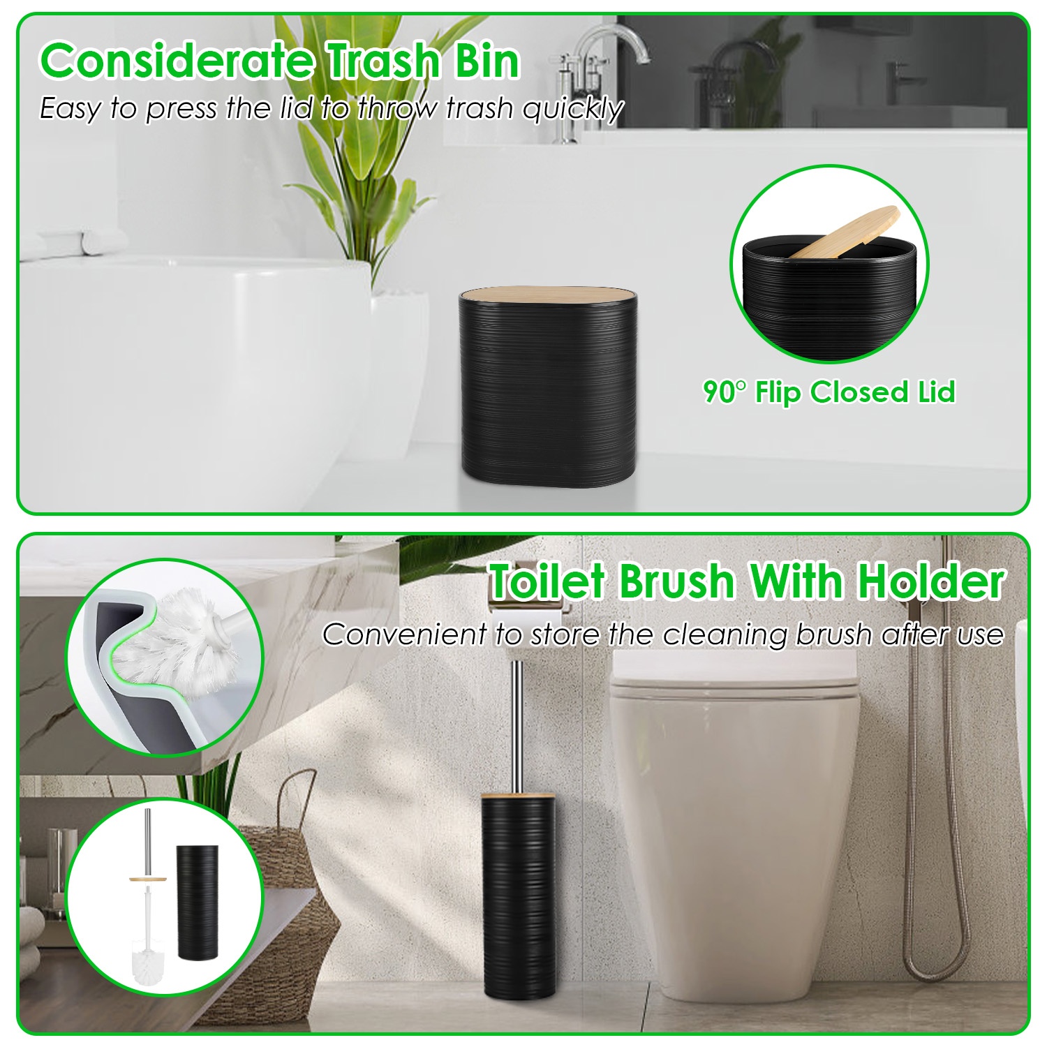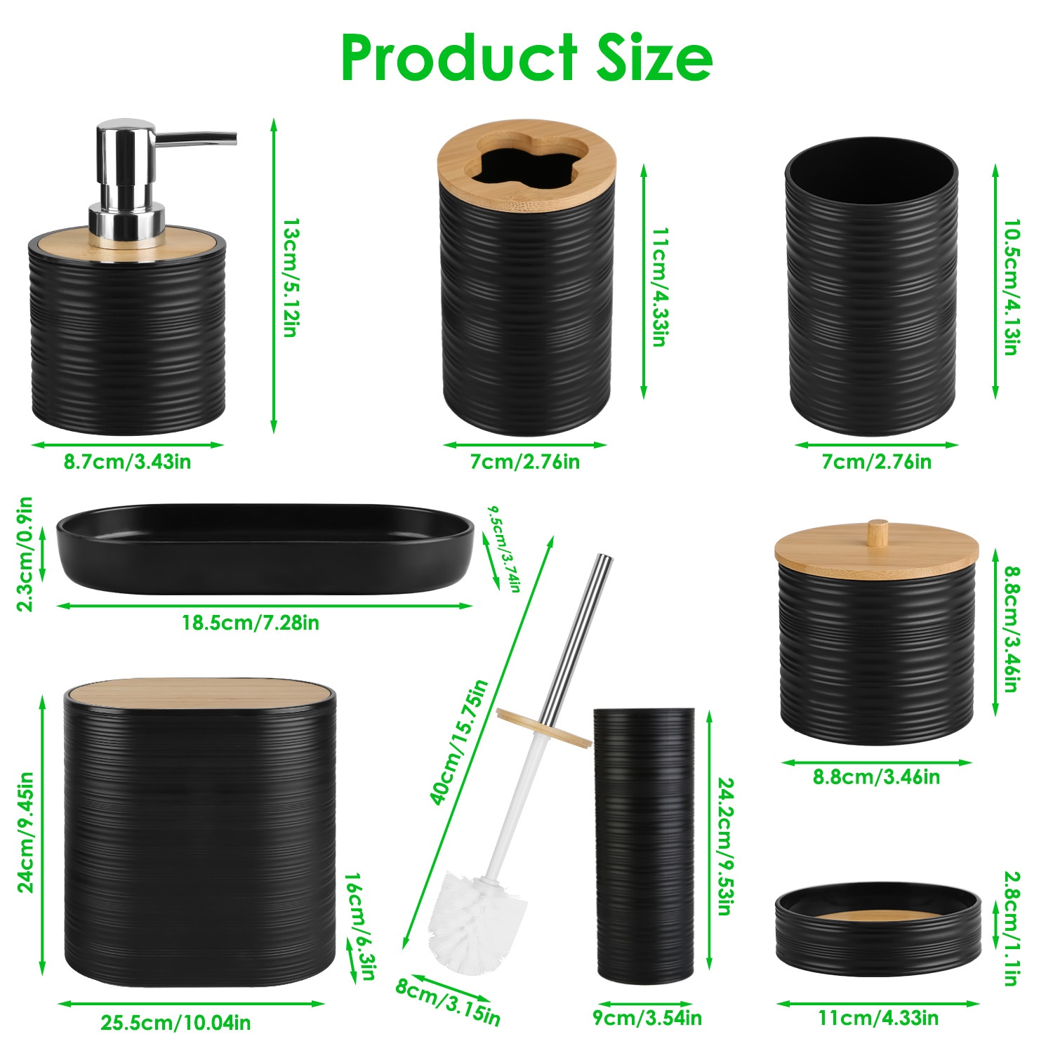 The 360° cleanable toilet cleaning brush comes with a particular holder to hold it after use,the toothbrush holder adopts a bamboo flower-shape mouth to hold at least two brushes,the toothbrush cup to hold your toothpaste,the soap dish with bamboo hollow mat can help dry the water on the soap,the vanity tray can organize your razors,cosmetics or place candles,flowers and other decorations,the Qtip holder is able to store you cotton swabs and keep clean,the liquid soap dispenser offers easy operation and the trash bin allows you to press the lid to throw trash quickly.