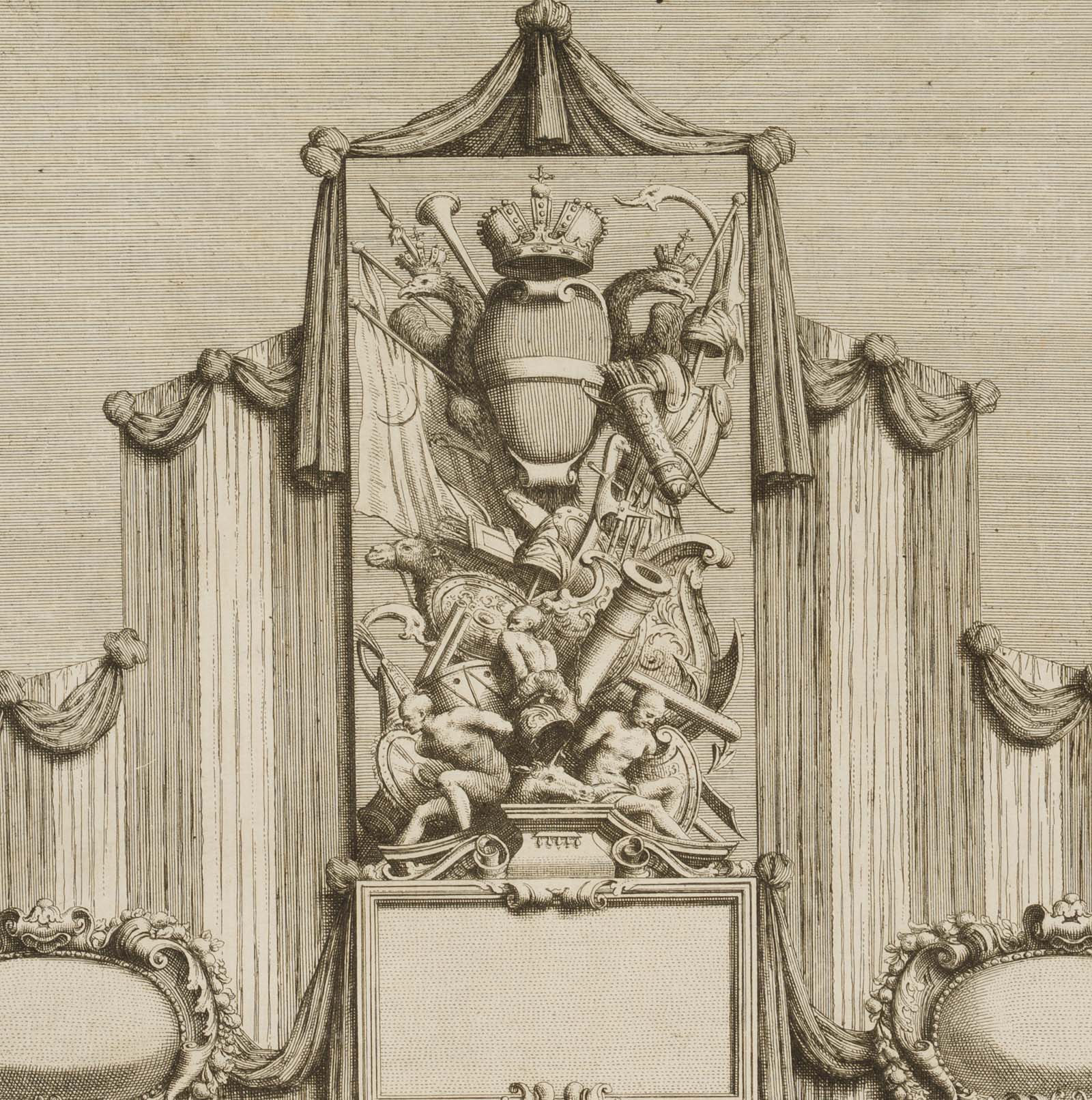 - Schlagworte: Trophäe, Doppeladler, Skelett, Entwurf, Grab, Architektur, Italien, Barock, 1700-1749