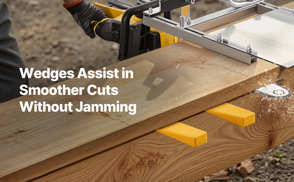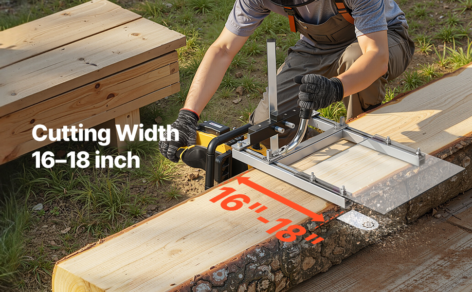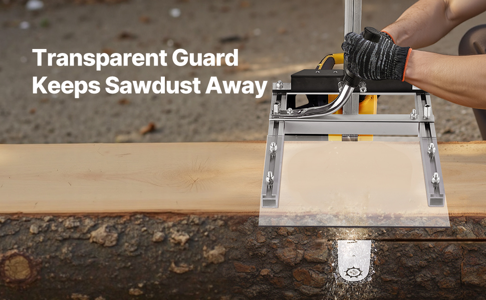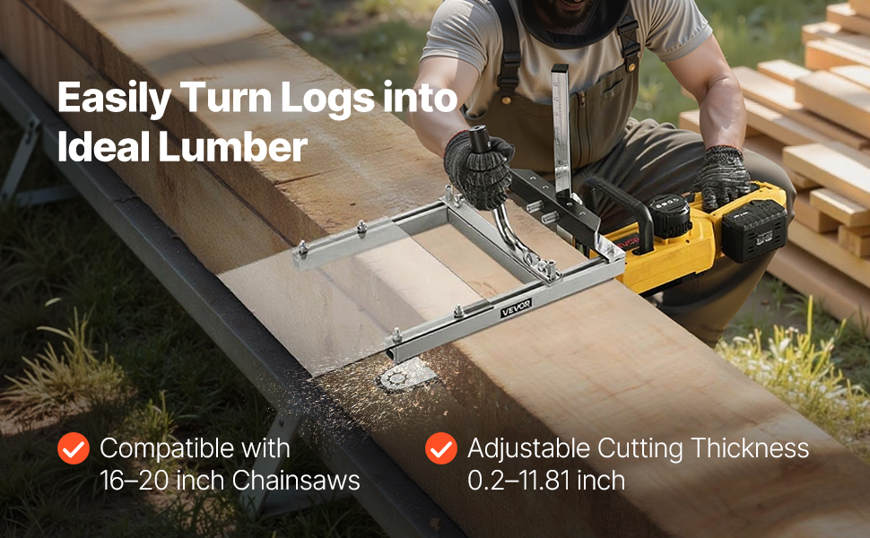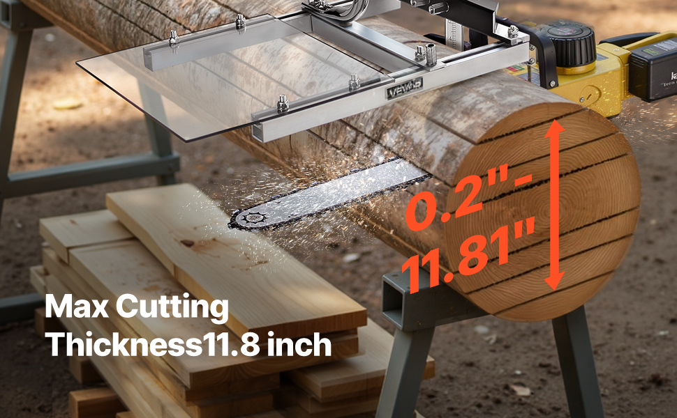Die Kettensägenmühle ist mit Kettensägenführungsschienen von 16 bis 20 Zoll (40,64 bis 50,8 cm) kompatibel und verfügt über eine Dickeneinstellung von 0,2 bis 11,81 Zoll (0,508 bis 29,99 cm), um verschiedenen Holzarten und Schnittanforderungen gerecht zu werden