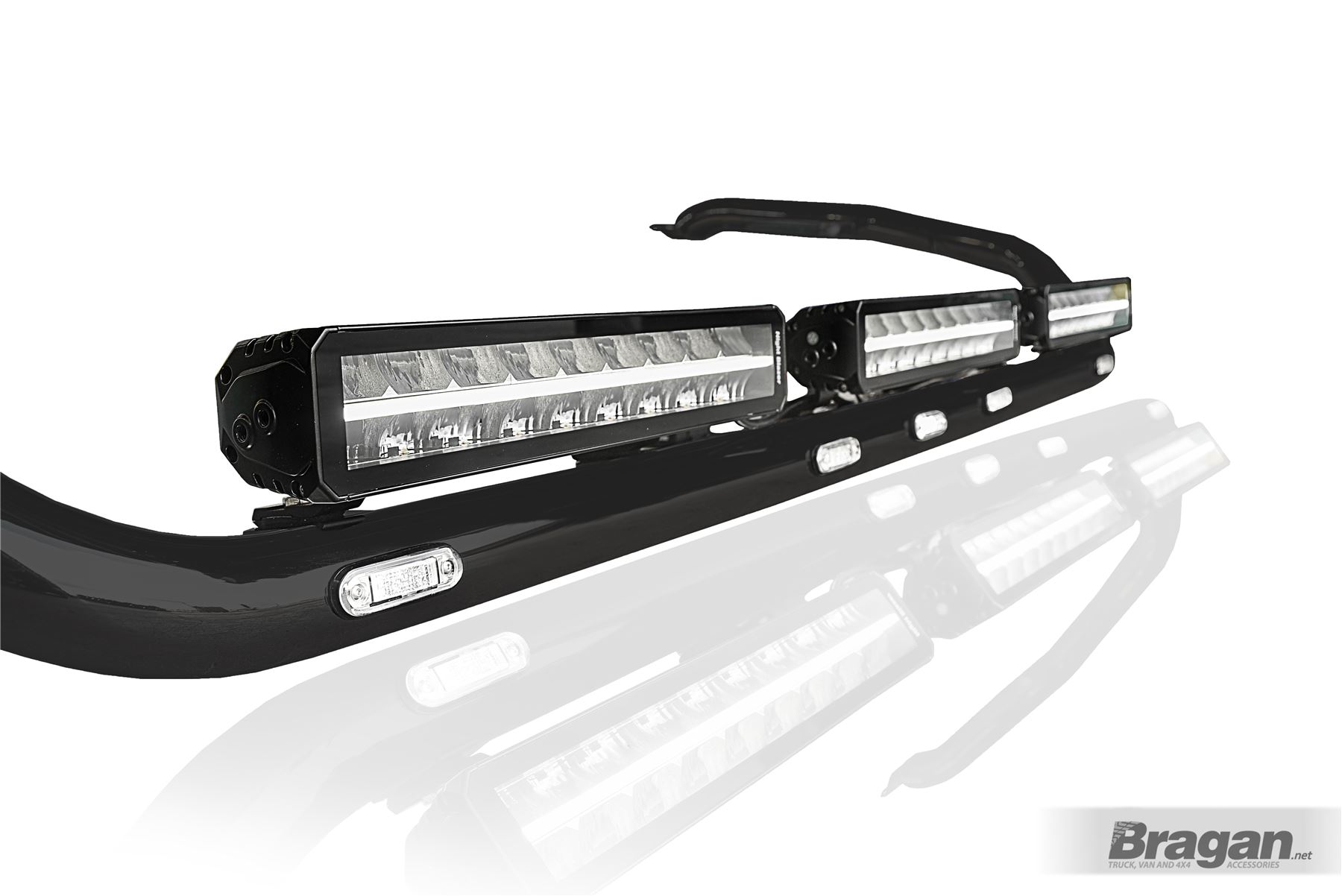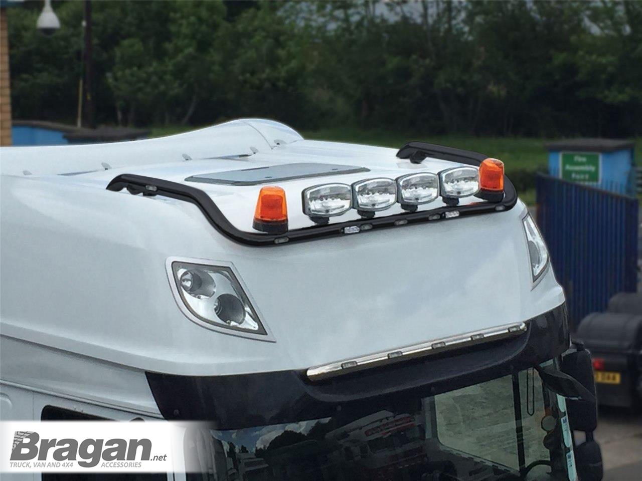 High quality Black Powder Coated Stainless Steel Spot Light Roof Bar with Flush LEDs x7 and LED Spot Light Bars x3 for DAF XF 106 2013+ Super Space Cab. These bars now have curved side ends.