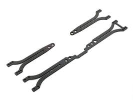 While the 420X chassis kit uses carbon fiber damper stays, this chassis kit employs aluminum mounts for precise angle adjustments based on the number of spacers uséd.