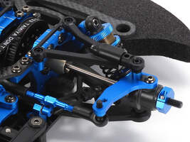 Suspension Arms are a rigid "A" design with 7mm longer span compared to the TRF420X for stable roll, while upper arm mounts can be slid to adjust camber. Three damper pivot positions are provided.