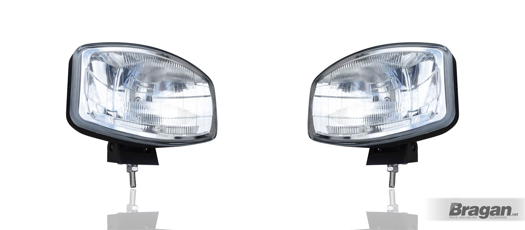 Comes with two 12-volt Jumbo Oval "Rugby Ball" Style Spot Lights (9.5 inch/245 mm) with additional park/side light LED function. Parking LED light bulb is integrated into lamps which illuminate when the side lights are switched on. This results in the lamps having 2 functions - the main beam and the park light beam.