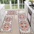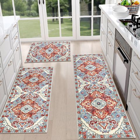 The MeyJey Boho Kitchen Rug Set includes three beautifully designed rugs that bring both function and style to your home. Made from durable high-density polyester, these rugs feature a distinctive boho distressed pattern in red, blue, and beige hues that complement various decor styles. Each rug is equipped with a non-slip backing that firmly grips floors to prevent slipping and sliding, enhancing safety in busy areas like kitchens and dining rooms. The machine washable construction allows for easy cleaning and maintenance, making it ideal for households with children or pets. These rugs absorb moisture effectively to keep floors dry and reduce the risk of stains. Their low-profile design ensures they fit comfortably under doors without causing tripping hazards. Whether placed in the kitchen, laundry room, living room, or even outdoor patios, this versatile set offers both aesthetic appeal and practical benefits. The sturdy edge stitching enhances durability for long-lasting use, while the lightweight material allows for easy repositioning or storage. Add a touch of exotic elegance and cozy comfort to your home with this attractive and functional rug set.