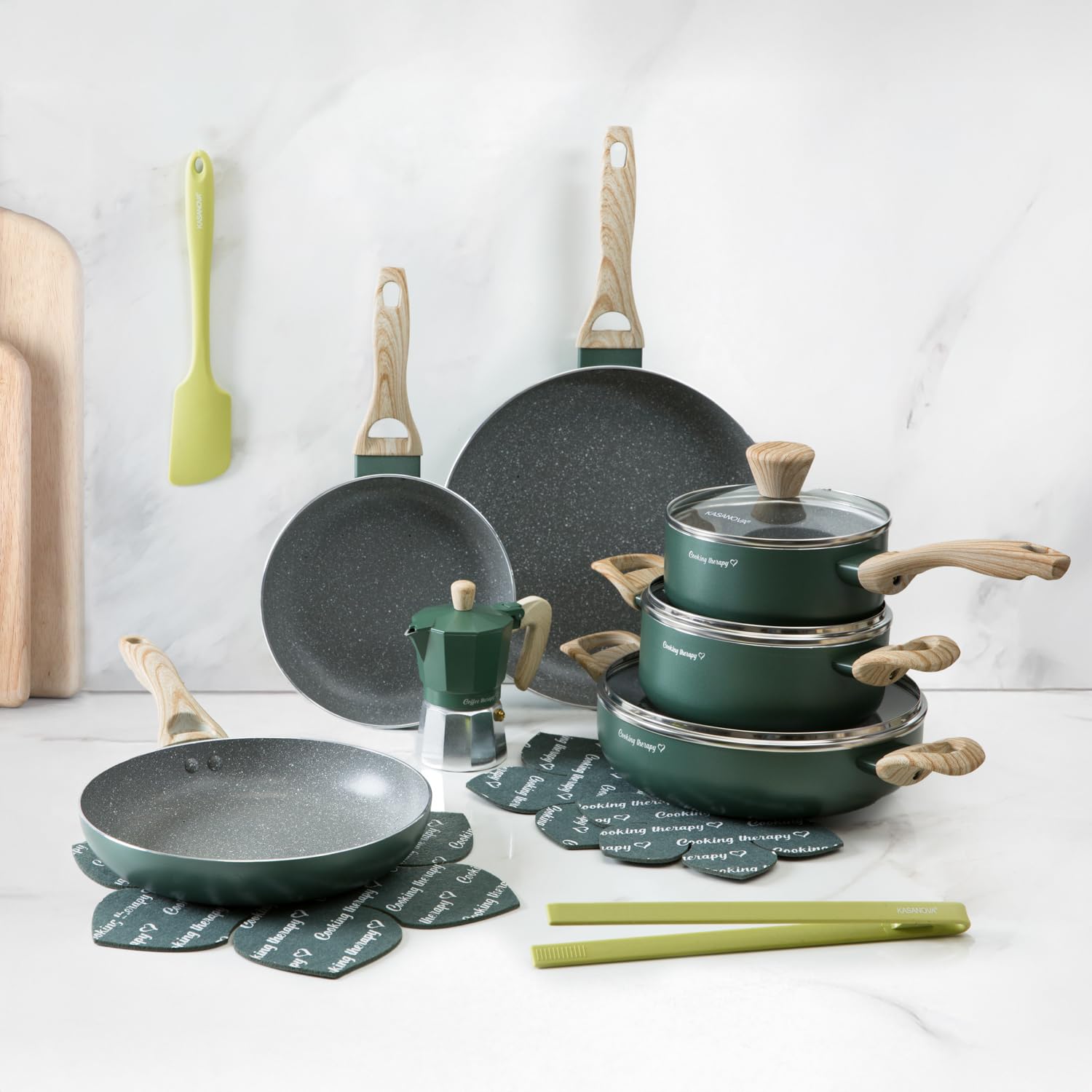 Il set cottura completo di pentole, caffettiera e utensili per le ricette di ogni giorno: cucinare è terapeutico, lo dice anche la scritta! Ottima antiaderenza, rapida pulizia e cotture efficienti. Fondo per induzione e tutti i piani cottura.