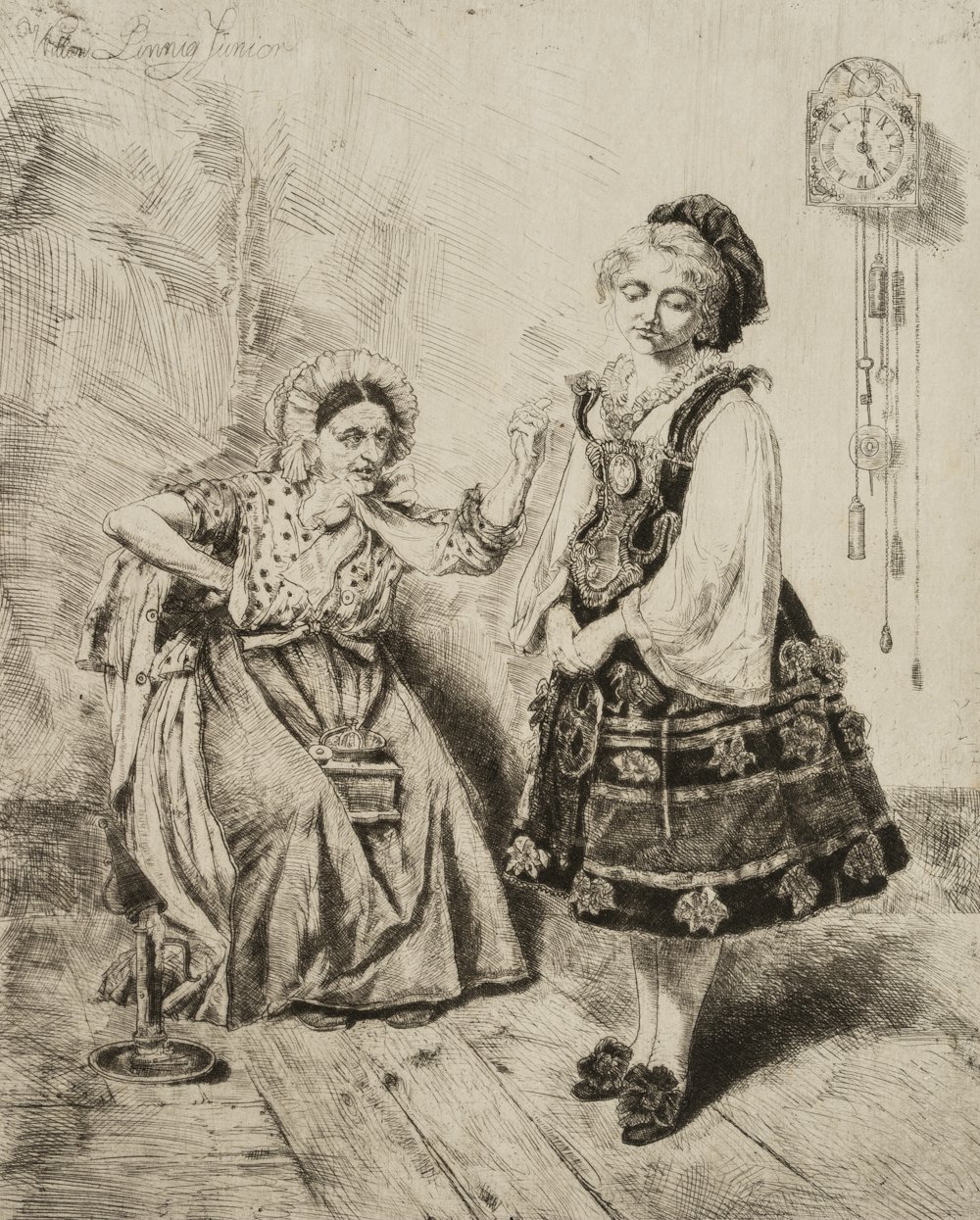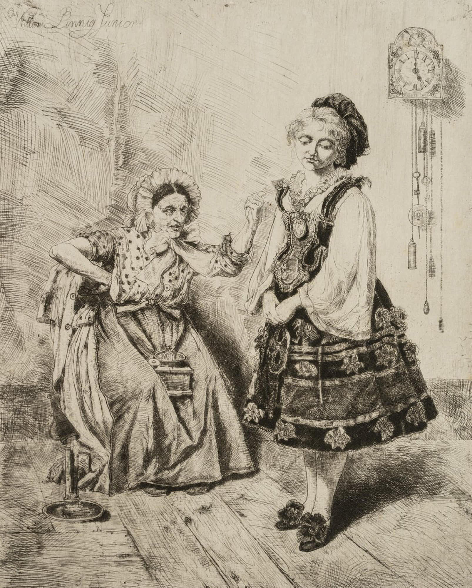 Willem Linnig Junior (1842 - 1890 ), Mütterliche Ermahnung, Zeternde Alte mit Trachtenmädchen, 19. Jahrhundert, Radierung