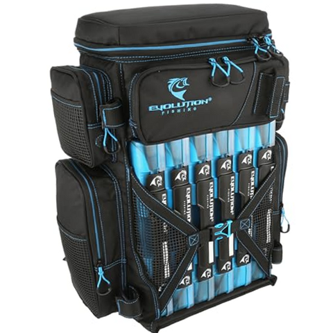 Evolution Fishing 3700 Drift Series Tackle Backpack covers your tackle transport needs with a highly durable and functional design. The rugged wear-resistant 1680-denier construction endures daily abuse. An innovative largemouth opening offers quick and easy access to up to 6 included 3700-size tackle trays. The top zippered compartment adds additional space to hold 4 more 3600-size trays (not included). The integrated tie-down Y-Strap with mesh support secures your trays inside the backpack. Use the 5 large exterior storage pockets and 4 rubber mesh slip pockets to organize all your accessories. Other angler-friendly details include plier holster, side pocket line spool feed, and a nonslip, waterproof bottom. Adjustable, heavy-duty backpack straps with sternum strap ensure comfortable carry while freeing up your hands to carry other fishing gear.