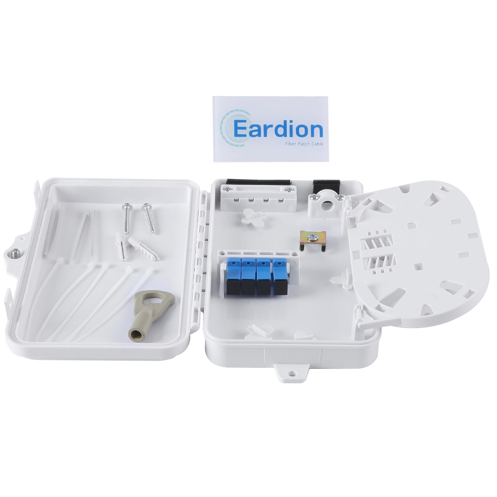 4-core FTTH optical fiber distribution box with sc fiber optic coupler Material: ABS PC. Size: 207 * 140 * 45mm. Resistance to external forces: greater than 500N. Protection level: IP65. Using brand new materials, durable, impact resistant, corrosion resistant, sealed and waterproof, safe and worry-free. It is suitable for the wiring connection of optical cable and optical communication equipment. Through the adapter in the wiring box, the optical signal is led out by the optical jumper to realize the optical wiring function. It is suitable for the protective connection of optical cables and distribution pigtails. It is also suitable for optical fiber terminal points in the optical fiber access network. It is suitable for multiple use scenarios: indoor, multi-layer, wall-mounted, pole-mounted, and new Old socket, FTTH fiber to the home.