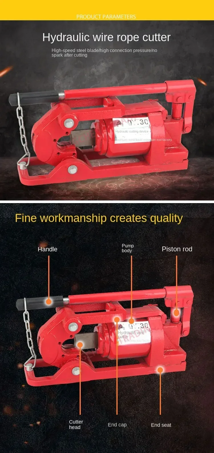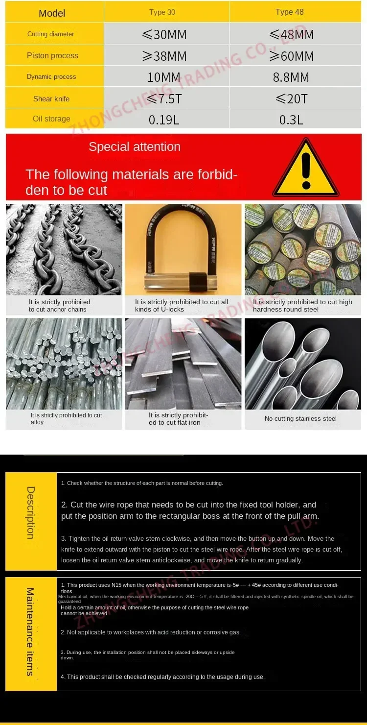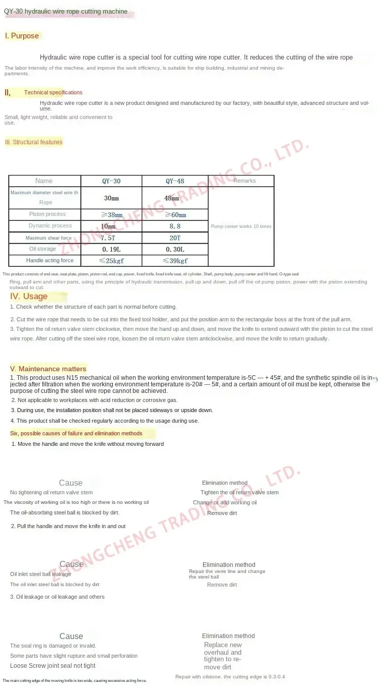 Model 30 has a self-weight of 15kg and a maximum pressure of 7.5. It can cut 30mm thick steel wire ropes