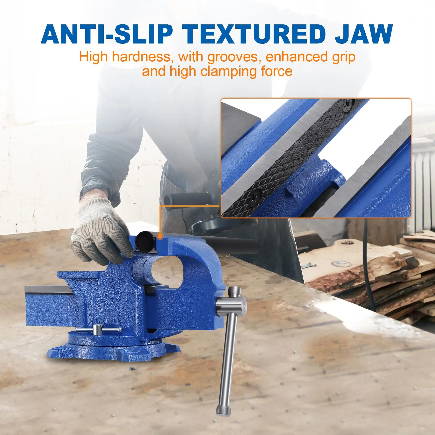 Has grooved steel jaw inserts and large anvil work surface
